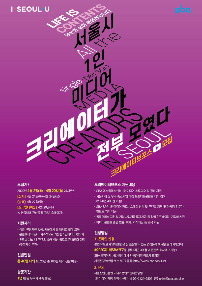 3. 문의 ◯ 서울산업진흥원 미디어콘텐츠산업팀 1인 미디어 크리에이티브포스 담당 - 김익수 선임(02-2124-2807, iskim@sba.seoul.kr)