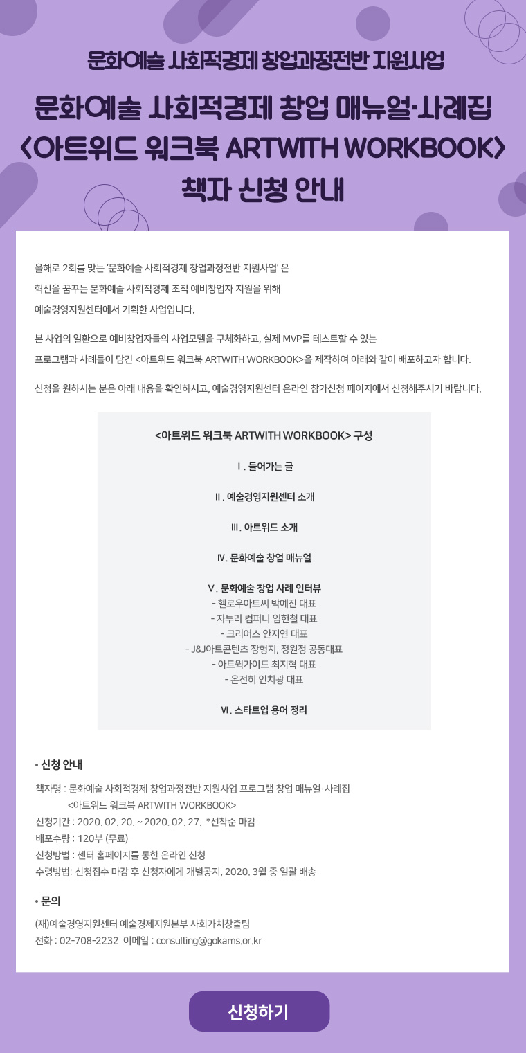 | 문화예술 사회적경제 창업 매뉴얼·사례집 <아트위드 워크북 ARTWITH WORKBOOK> 책자 신청 안내 | |||||