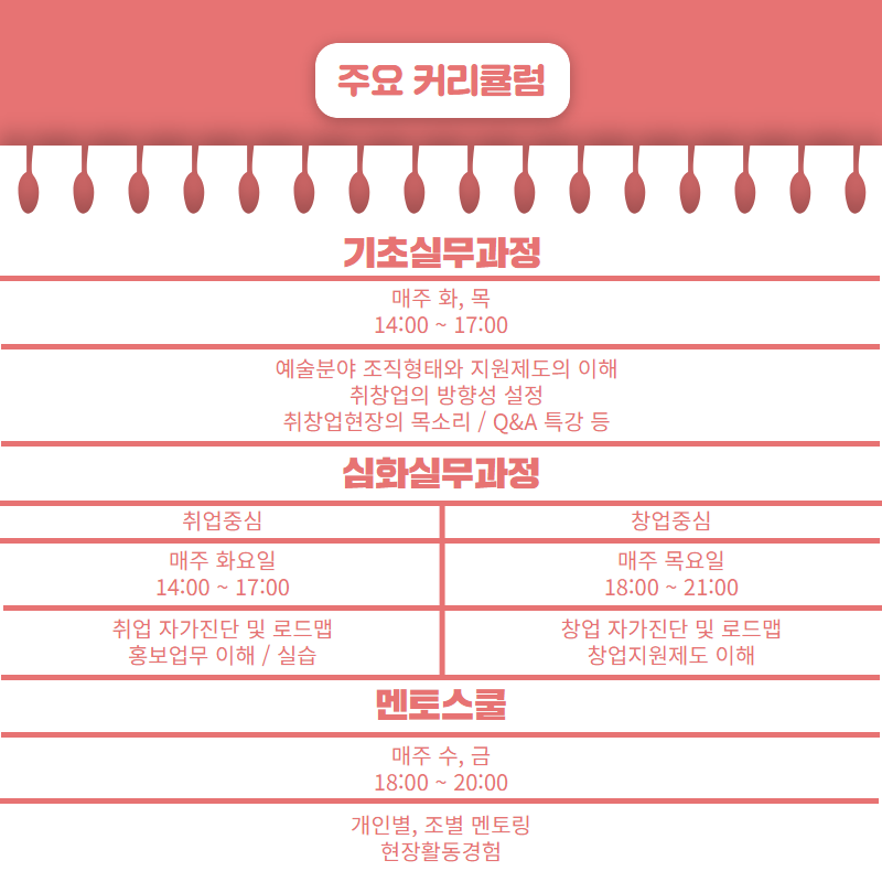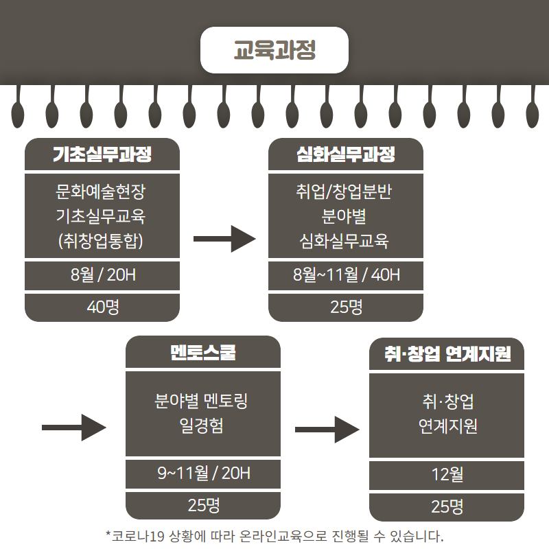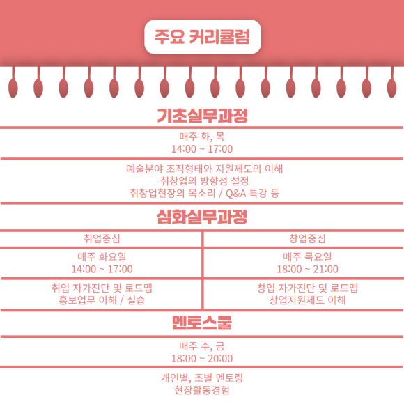 기초 실무과정에서는 - 예술분야 조직형태로부터 취창업 방향성 설정, 커리어 디자인 등 심화교육 취업과정은 - 취업자가진단 ~ 기초 행정실무 ~ 이력서, 사업계획서 작성실무 등 심화교육 창업과정은 - 창업자가지단 ~ 로드맵 ~ 비즈니스모델 ~ 창업지원제도이해 및 사업계획서 등 현장위주의 실무교육과 현장전문가와의 Q&A, 네트워킹 등으로 진행됩니다.