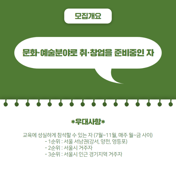 문화예술분야 취창업을 준비중이신 분들 참고하세요 본 교육은 고용노동부 지원사업으로 양천디지털 상상캠퍼스 주관으로 진행되는 무료 교육입니다. 문화예술 취창업을 준비중이신 분들에게 현장위주의 행정실무교육과 실습, 현장 전문가와의 Q&A, 멘토링, 일경험으로 구성된 교육으로 교육생들에게 수료 후 실질적인 도움을 드리고자 기획된 사업입니다. ![]()