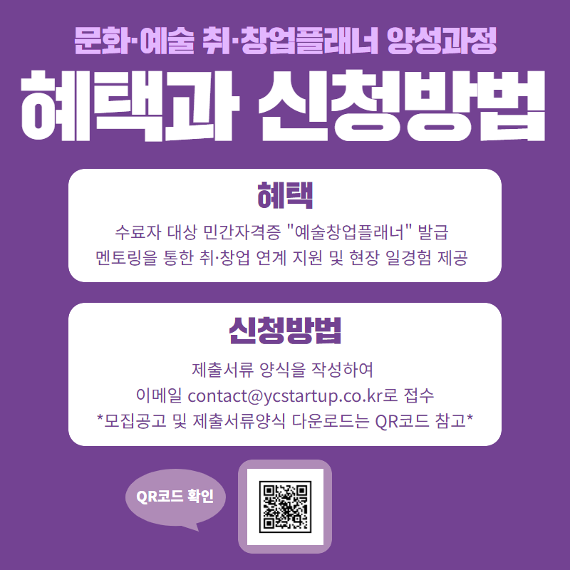 교육은 무료입니다. 문화예술분야로 취창업을 준비중이신분들의 관심과 신청을 기대합니다. 참가신청 바로가기 : https://ycstartup.co.kr/bbs/board.php?bo_table=B11&wr_id=68