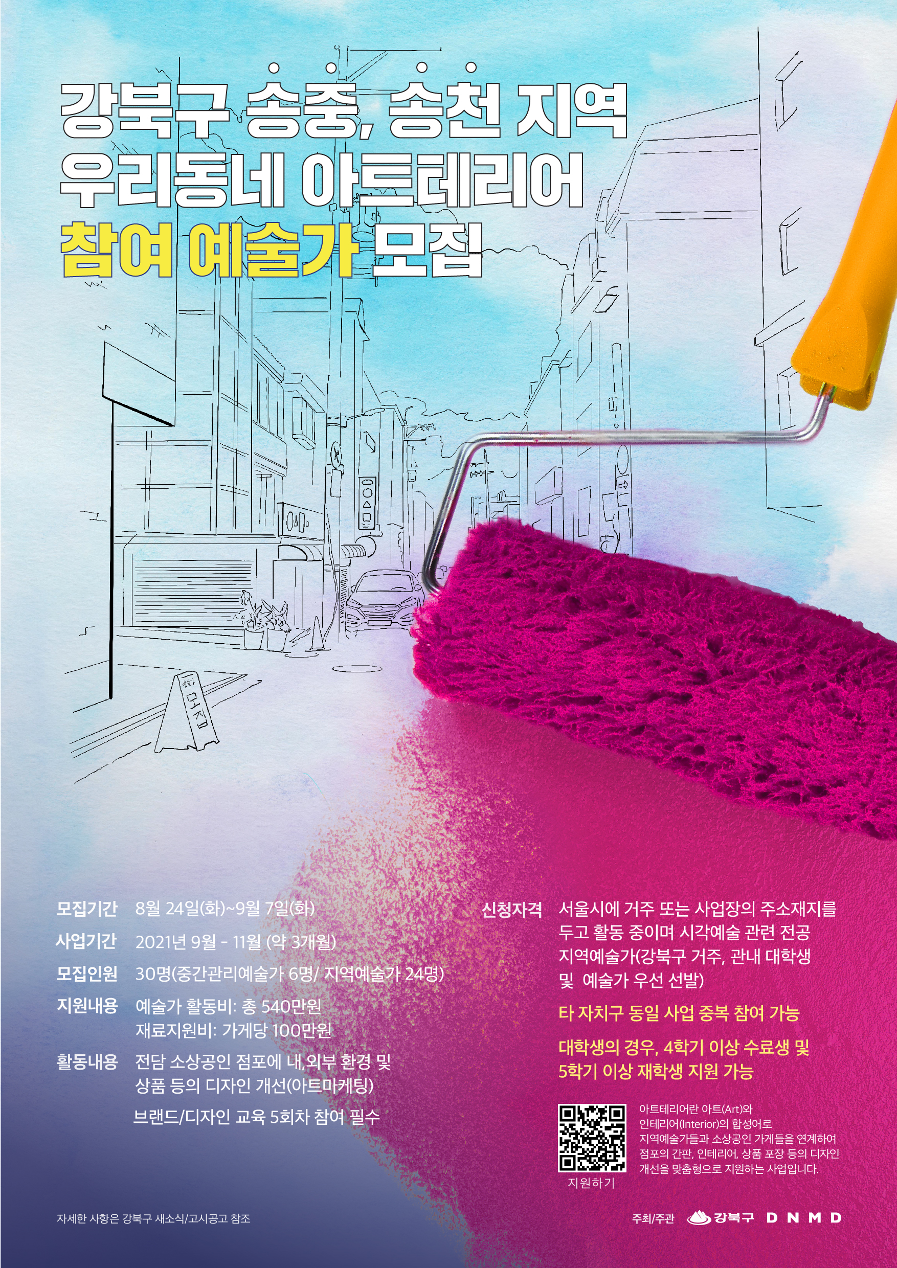 ![]() 모집 연장 및 참여 조건 확대 안내 강북구와 디노마드가 함께하는 <강북구 송중,송천 지역 우리동네 아트테리어 지원사업>에서 참여예술가 분들을 모집합니다! ----- ✔강북구 거주, 관내 대학생 및 지역 예술가 우선 선발 ✔대학생의 경우, 4학기 이상 수료생 및 5학기 이상 재학생 지원 가능 ✔타 자치구 동일 사업 중복 참여 가능 ----- ◼ 활동기간 : 2021년 9월~ 11월 (필수교육 15시간 포함) ◼ 모집인원 : 중간관리예술가 6인, 지역예술가 24인 ◼ 지원내용 : 활동비 540만원 & 재료지원비 가게당 100만원 ◼ 아트테리어 사업 신청 및 제출 : https://forms.gle/CQ8o3bcn5w1yNWFF8 ◼ 아트테리어 사업 신청서 다운: 강북구청 새소식 게시판: https://www.gangbuk.go.kr/www/boardView.do?key=285&boardSeq=41&post=1103196 ◼ 모집일정 : 2021. 08. 24. ~ 2021. 09. 07. 23:59까지 ◼ 발표안내 : 2021. 09. 13. 15시 이후(강북구청 새소식 게시판 공지 및 개별 안내 예정) ◼ 온라인 오리엔테이션 일정 : 추후 안내 ◼ 문의 : https://open.kakao.com/o/ggViY1vd ❗ 오픈 채팅방에서는 사업에 대한 자세한 질문 및 답변이 모두 가능합니다. 예술가분들의 많은 지원 바랍니다. ----- ✔ 아트테리어란? 아트(Art)와 인테리어(Interior)의 합성어로 지역예술가들과 소상공인 가게들을 연계하여 점포의 간판, 인테리어, 상품 포장 등의 디자인 개선을 맞춤형으로 지원하는 사업입니다.