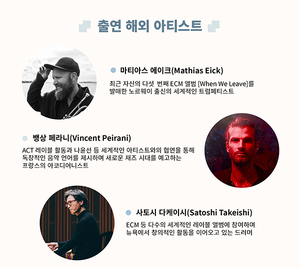 ㅣ공연안내 · 일시: 2021. 10. 17(일) 오후7시 · 장소: 북촌창우극장 · 주최, 주관: 엔플러그 · 후원: 한국문화예술위원회 · 출연진: 마티아스 에이크, 뱅상 페라니, 사토시 다케이시, 허윤정, 이아람, 김보라, 김율희, 첼로가야금 · 가격: 전좌석 20,000원 · 예매처: 네이버 예약 (10/7(목) 오후 6시 오픈) ㅣ출연진 소개 ![]() ![]() ![]() |