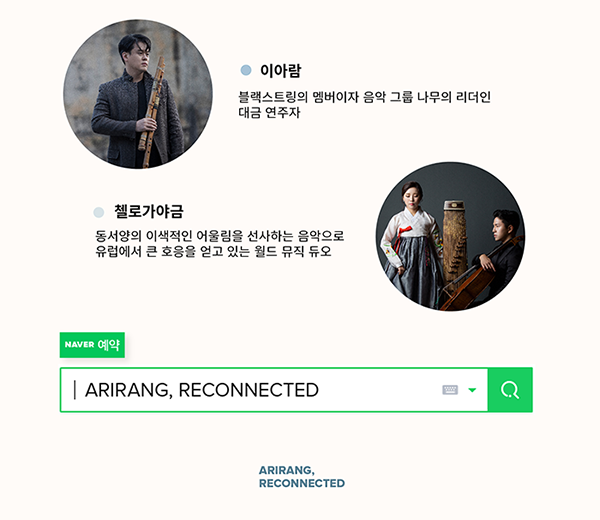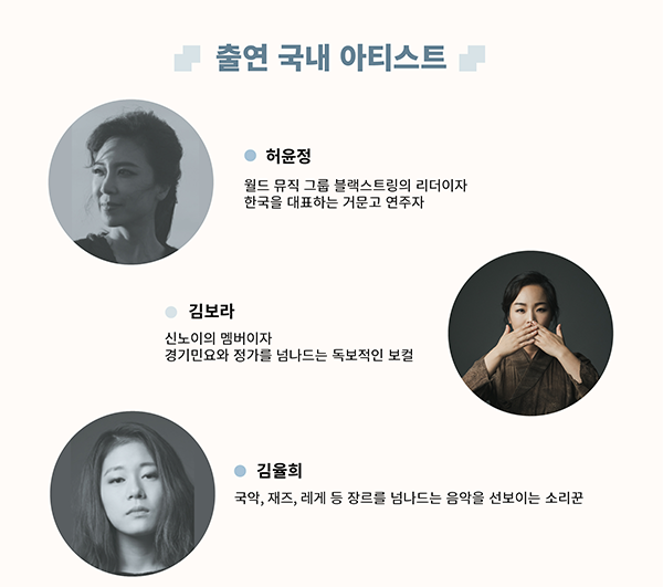 작년 12월, 월드 재즈스타 나윤선이 음악감독을 맡고 국내와 해외 아티스트들의 콜라보로 발매 되었던 앨범 [Arirang, The Name of Korean vol.8]의 출연진들이 대부분 참여하여 그 당시 서로 만나지 못한 채 작업을 했던 아쉬움을 달래고, 다른 문화간의 음악적 영감을 더하는 공연을 선사할 것이다. 듀오, 트리오, 합주 등 다양한 형태로 구성 될 이번 공연은 특히 서양의 관악기, 타악기, 일렉트릭 사운드와 한국의 관, 현악기 그리고 정가와 판소리의 소리꾼이 함께하는 다채로운 조합으로 관객들에게 신선하고도 현대적인 우리의 전통 음악을 들려줄 예정이다.