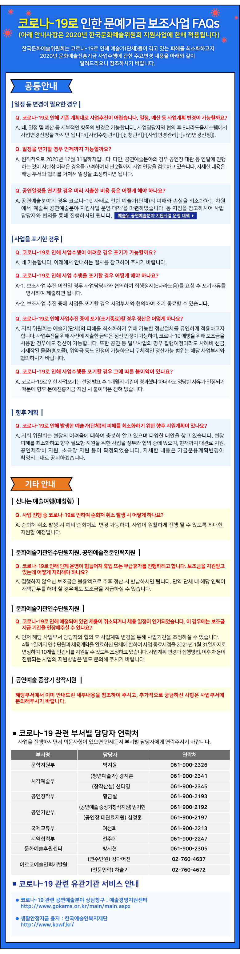 | [한국문화예술위원회] 코로나-19로 인한 문예기금 보조사업 FAQs | |||||