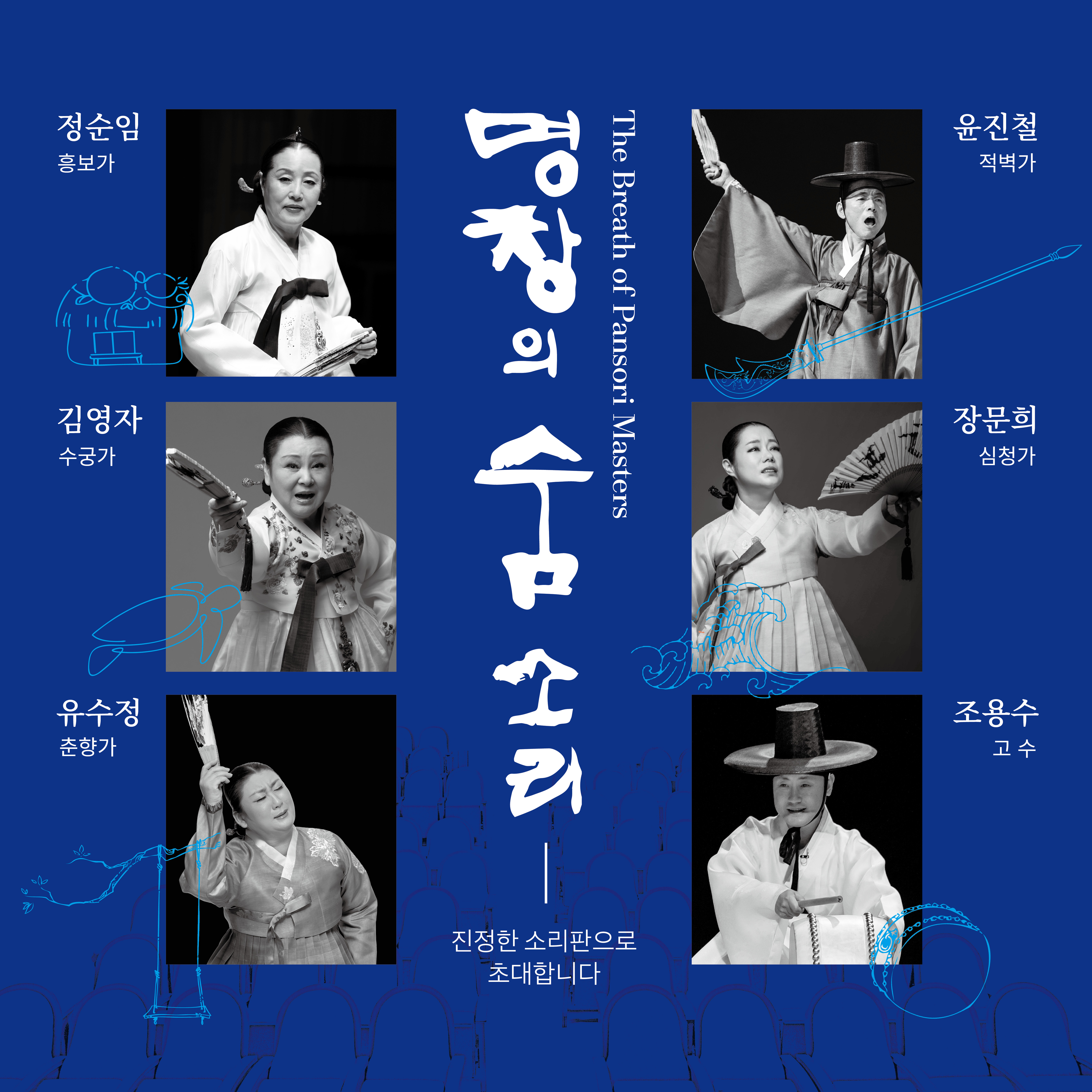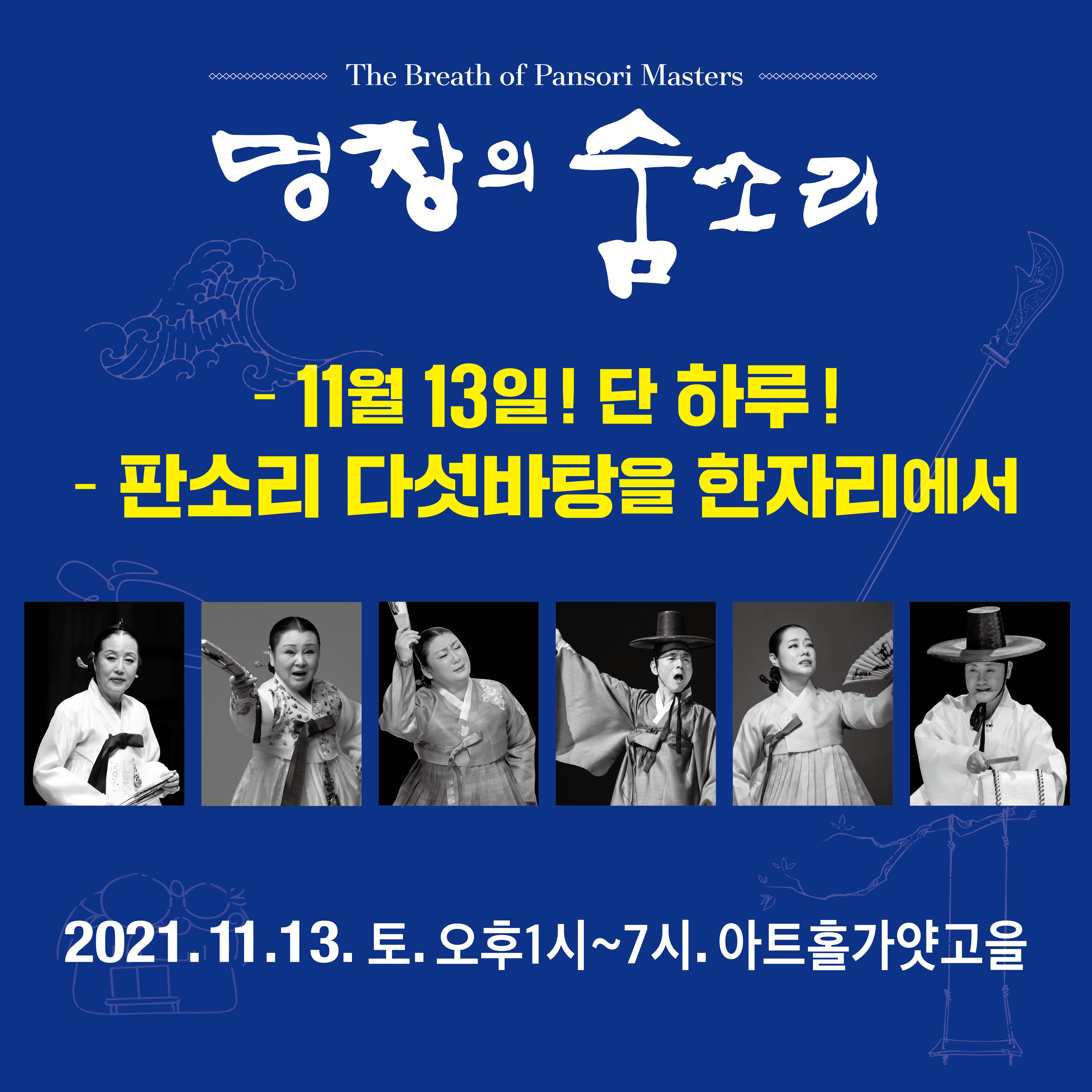 2021년 아트홀가얏고을 명인명창 기획공연 '제4회 명창의 숨소리' The Breath of Pansori Masters 단하루! 5시간! 대한민국 최고의 명창과 명고수, 그리고 관객이 펼치는 판소리 대장정! 진정한 소리판으로 초대합니다. [초대명창] 정순임의 흥보가 김영자의 수궁가 유수정의 춘향가 윤진철의 적벽가 장문희의 심청가 * 일시: 2021. 11.13. 토. 오후 1시~7시 * 장소: 아트홀가얏고을 * 티켓 : 전석 25만원 (11월 6일까지 사전예매시 40% 할인- 15만원 / 선착순 50명) * 예매 : 입금 후 전화 (신한 110485777318 아트홀가얏고을) * 문의: 02-553-0067 |