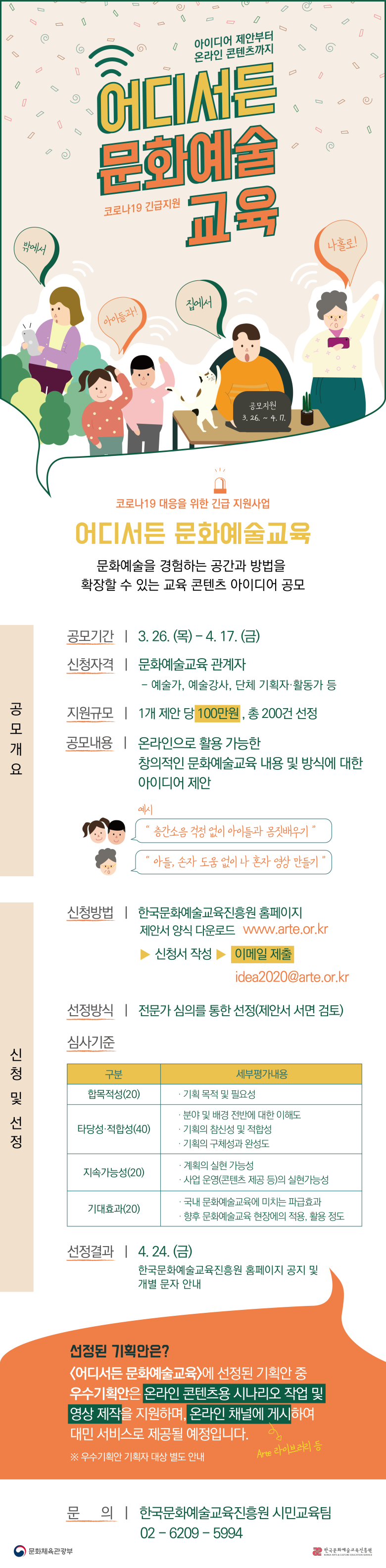 한국문화예술교육진흥원에서 코로나19 대응을 위한 긴급 지원사업으로 '어디서든 문화예술교육' 아이디어를 공모중입니다. 이번 공모는 사회적 거리두기와 비대면을 초래하는 현상에 대응하여 참신한 문화예술교육의 방식을 함께 모색하기 위한 새로운 시도의 지점을 찾는 공모로, 당선될 경우 상금과 더불어 해당 기획안에 따른 시나리오 작업, 영상 제작 등을 통해 온라인채널에 배포될 예정입니다.