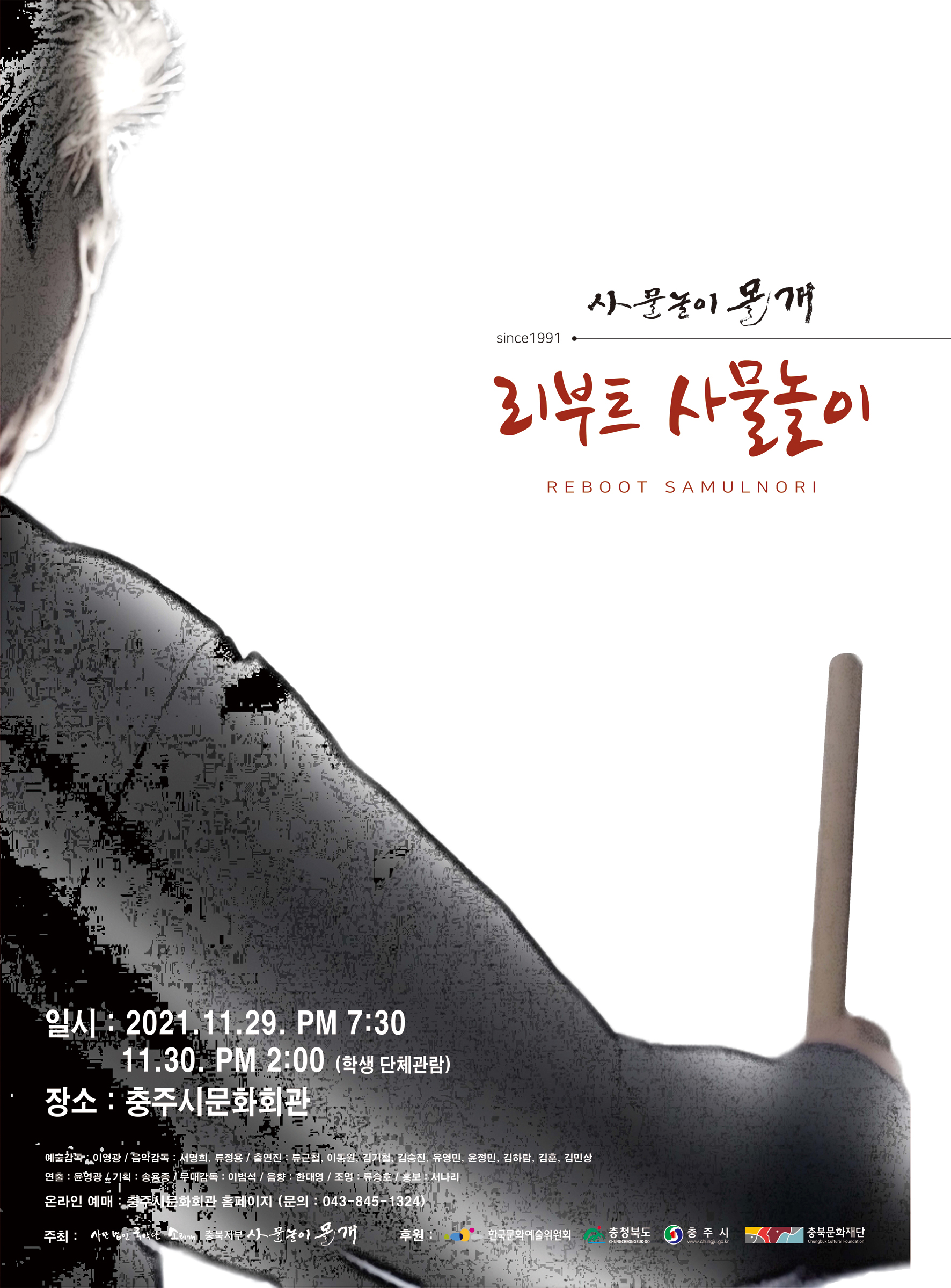 ![]() 안녕하십니까. 사물놀이 몰개입니다. 오랜만에 대면 공연 소식입니다. 충주시 문화회관에서 상주단체 창작 초연작품을 무대에 올리게 되었습니다. ‘사물놀이, 새롭게 태어나다’ 라는 부제의 많은 관람 바랍니다. 공연명 : Reboot 사물놀이 공연장소 : 충주시 문화회관 초대일시 : 11월29일 오후 7시30분 온라인예매 : 충주시 문화회관 홈페이지 043-850-3912 문의 : 043-845-1324 본 공연은 코로나19 방역 수칙을 준수하여 체온측정 및 안심콜 완료 후 객석으로 입장 가능합니다.