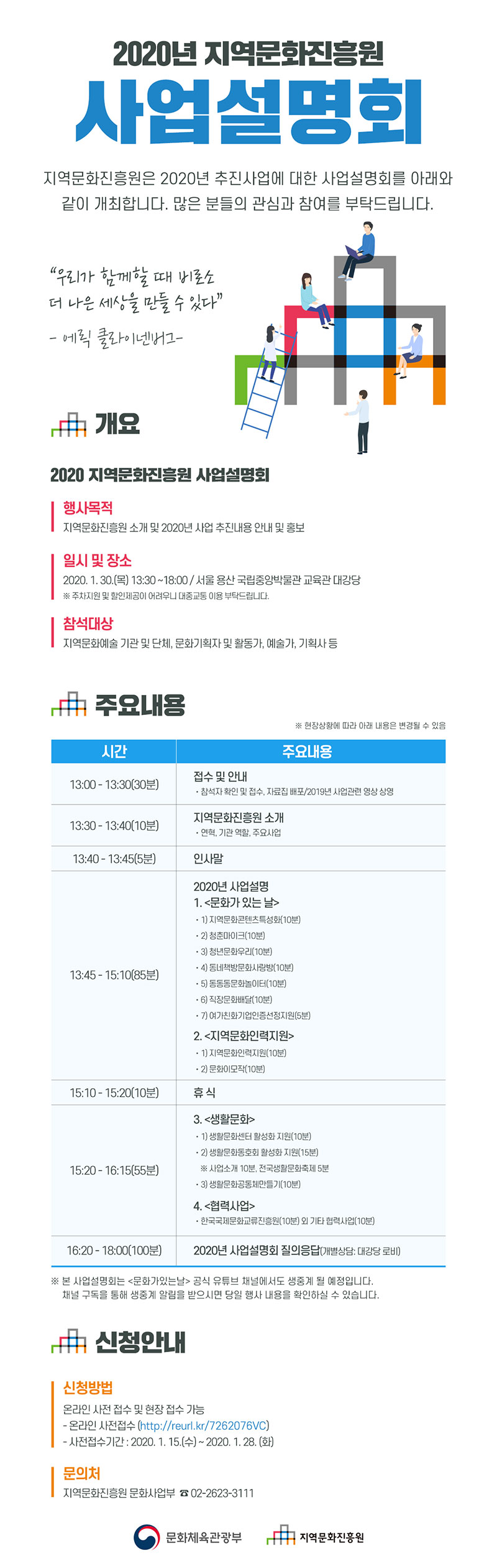 중국발 코로나바이러스에 의해, 해당일정이 전격 취소되었습니다!!!2020 지역문화진흥원 사업설명회공지 | 2020-01-16