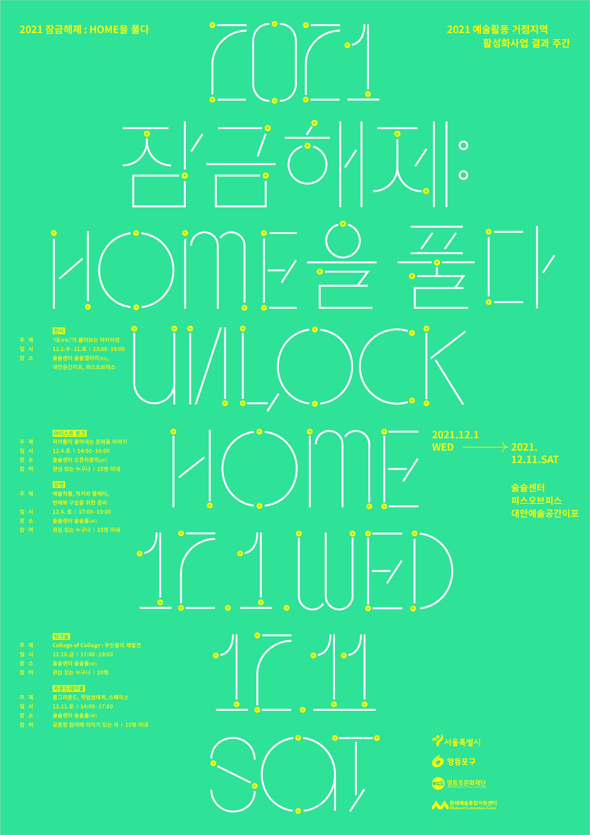 지속가능한 예술생태계를 만들기 위한 예술가들의 활동 과정과 결과들을 모은 결과 주간 <잠금해제: HOME을 풀다>가 12월 1일부터 11일까지 열립니다. 다양한 주체들의 예술활동 활성화를 위한 노력을 다양한 프로그램을 통해 만나보세요!