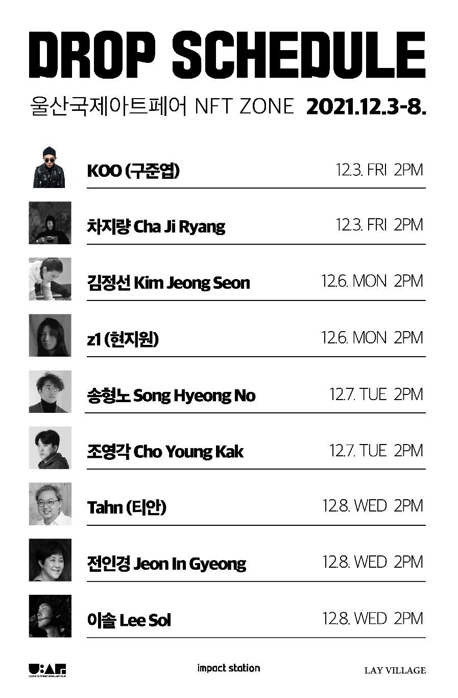 ![]() 국내 개최 국제아트페어 최초 NFT 특별섹션 오픈! ‘울산국제아트페어 NFT ZONE’ DROP SCHEDULE 2021.12.3.-8. 2PM 12.3. FRI 2PM– 구준엽 차지량 12.6. MON 2PM – Z1 김정선 12.7. TUE 2PM – 송형노 조영각 12.8. WED 2PM – 티안 전인경 이솔 바로가기>> www.piecial.com |