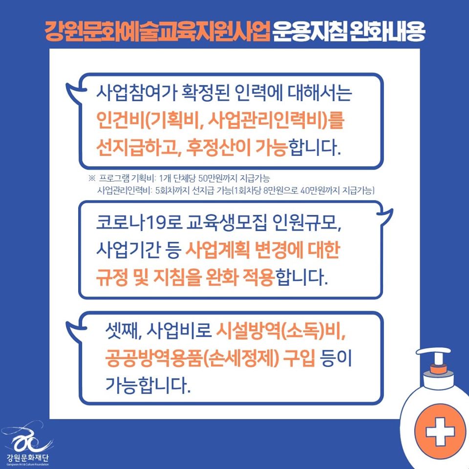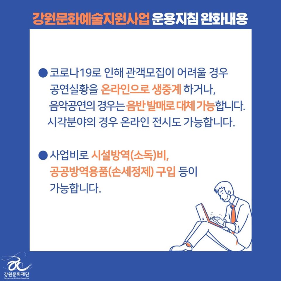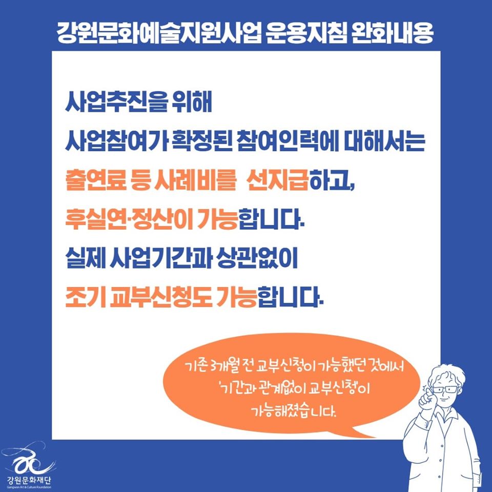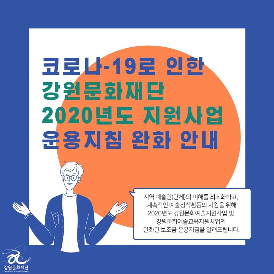 | 코로나-19로 인한 강원문화재단 2020년도 지원사업 운용지침 완화 안내 | |||||