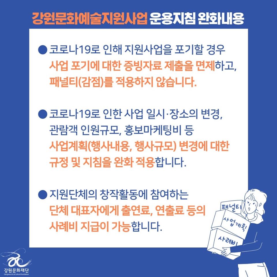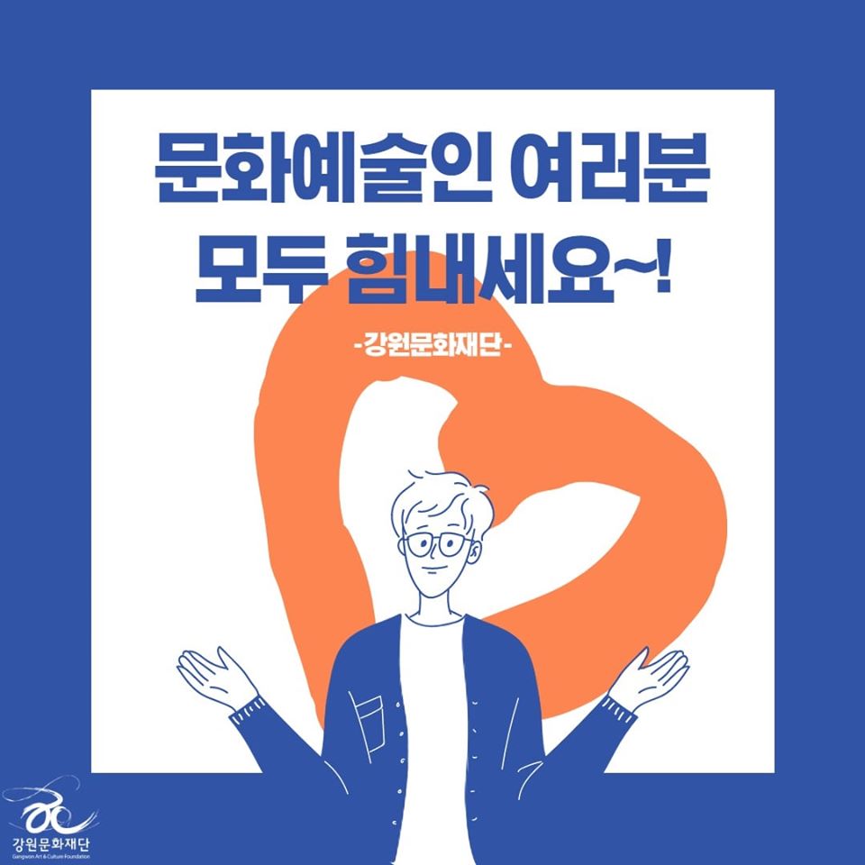 강원문화재단에서 코로나-19로 인한 지역예술인의 피햬를 최소화하고자, 강원문화재단에서 운용 중인 문화예술지원사업, 문화예술교육지원사업, 보조금 운용지침에 대한 완화조치를 적용합니다. 관련하여 강원문화재단은 누구나 이해하기 쉽게 카드뉴스로 정리하여 페이스북 ( https://www.facebook.com/gogwcf )에 공유하였으니 많은 참고바랍니다. 해당 내용은 강원문화재단 홈페이지 ( http://www.gwcf.or.kr/ko/foundation-news/notice.html )에서도 확인 가능합니다. ![]() ![]() ![]() ![]() ![]() ![]() |