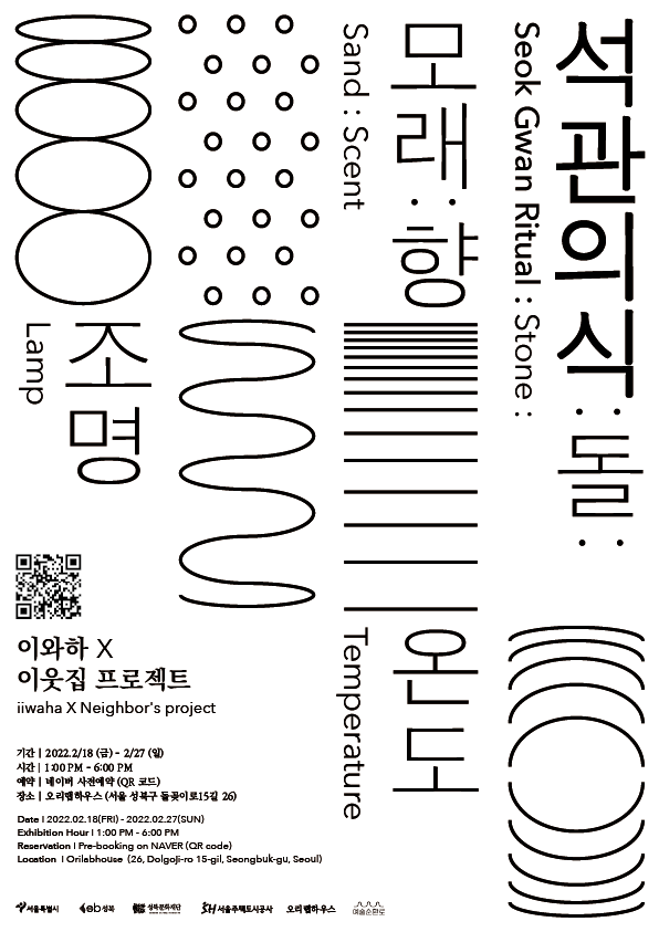 ![]() 예술순환로 이웃집프로젝트 석관의식전시가 오리랩하우스에서 진행 될 예정입니다 : ) "이와화X이웃집프로젝트" 지역 내 공간 네크워크 구축을 위해 예술순환로가 허브가 되어 작가와 공간의 연결 고리를 만들어주는 프로젝트입니다. 이번 이웃집프로젝트 석관의식 전시는 이와하작가가 석관을 거닐며 다양한 시각으로 지역을 기록하고, 기록물들을 전시로 풀어갑니다. <석관의식 : 돌 : 모래 : 향 : 온도 : 조명> 일시: 2022.02.18(금)-02.27(일) 13:00~18:00 장소: 오리랩하우스(성북구 돌곶이로 15길 26) 전시 예약 및 안내 : https://booking.naver.com/booking/10/bizes/648493 ※네이버 사전 예약접수 후 전시 관람이 가능합니다. |
