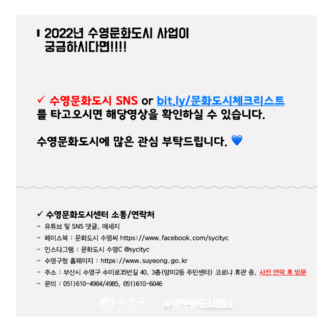 * 주변에 링크를 많이 전해주시면 문화도시 수영을 만들어가는데 큰 도움이 됩니다. 감사합니다.