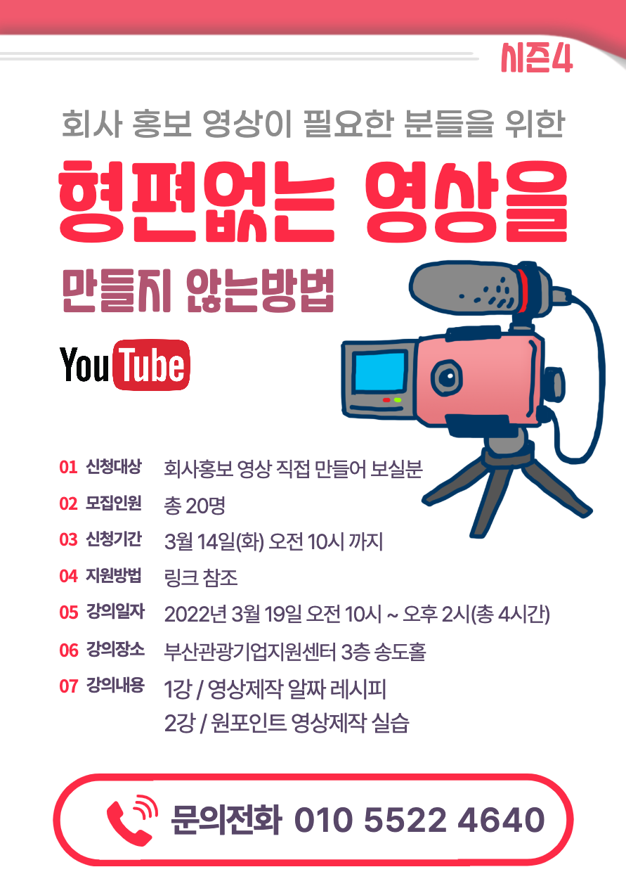 접수 대상 : 회사홍보 영상 직접 만들어 보실 분 접수 : 2022년 3월 14일 10시까지 교육 일시 : 2022년 3월 19일 10시 ~ 14시 (총 4시간) 교육 장소 : 부산관광기업지원센터 3층 송도홀 교육 인원 : 20명 주최 : 엑스더놀다 문의 : 010-5522-4640 (담당자 윤필우PD)