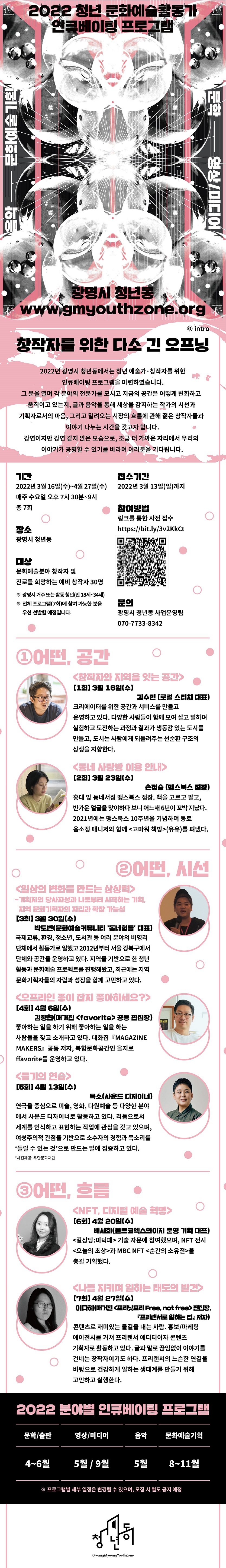 2022 청년동 문화예술활동가 인큐베이팅 프로그램_intro <창작자를 위한 다소 긴 오프닝> · 기간 : 2022년 3월 16일(수)~4월 27일(수) 매주 수요일 오후 7시 30분~9시 / 총 7회 · 장소 : 광명시 청년동 · 대상 : 문화예술분야 창작자 및 진로를 희망하는 예비 창작자 30명 ※ 광명시 거주 또는 활동 청년(만 18세~34세) ※ 전체 프로그램(7회)에 참여 가능한 분을 우선 선발할 예정입니다. · 접수기간 : 2022년 3월 13일(일)까지 · 참여방법 : 링크를 통한 사전 접수 ▶ 접수 바로 가기 : https://bit.ly/3v2KkCt