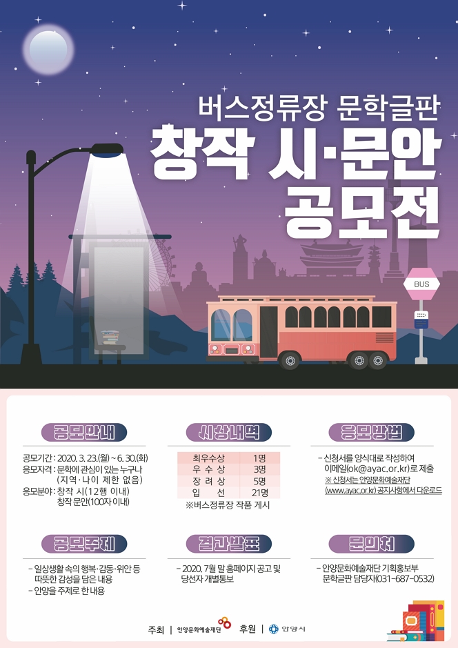 안양문화예술재단에서 안양시민들에게 삶의 행복과 희망 메시지를 전달하는 「버스정류장 문학글판」 창작 시, 창작 문안을 공모 중입니다. 문학에 관심있는 사람들은 누구나 창작시와 창작문안으로 신청 가능하며, 오는 6월 30일까지 접수받고 있습니다.