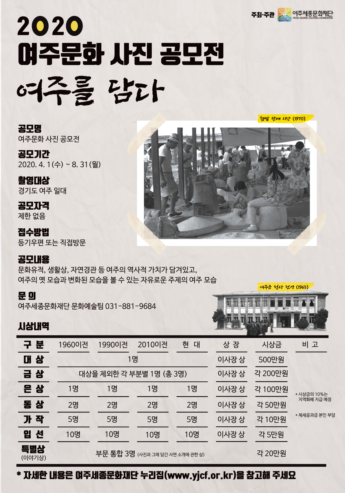여주세중문화재단에서 여주의 역사와 현재를 담은 사진공모전을 진행하고 있습니다. 8월 31일까지 접수받고 있으니 관심있는 분들은 참고 바랍니다. 역사가 숨 쉬고 있는 여주의 옛 모습과 현재의 모습을 기록으로 남겨 보존하고, 여주의 아름다움과 가치를 널리 홍보함으로써 역사와 문화, 관광이 어우러진 도시 면모를 기억하고 보존하고자 「여주. 문화」(부제 : 여주를 담다.) 사진공모전을 시행합니다. 자세한 내용은 첨부파일 확인을 부탁드립니다.