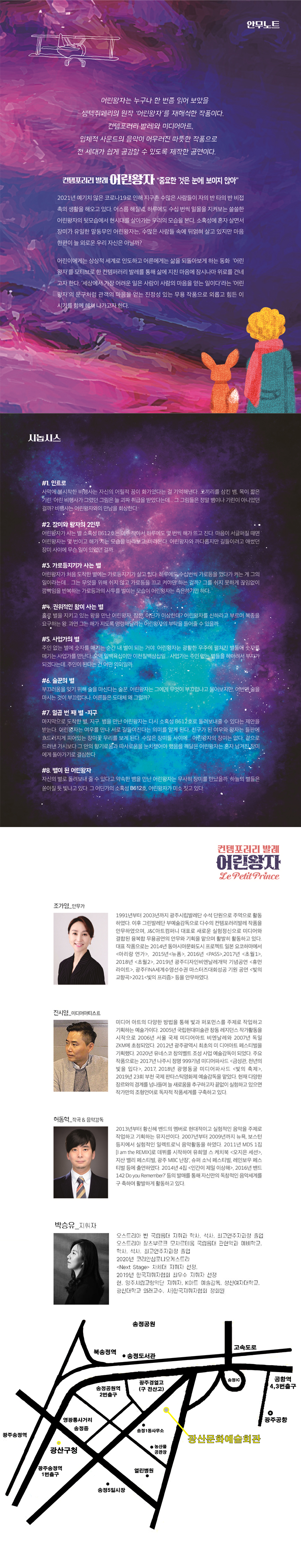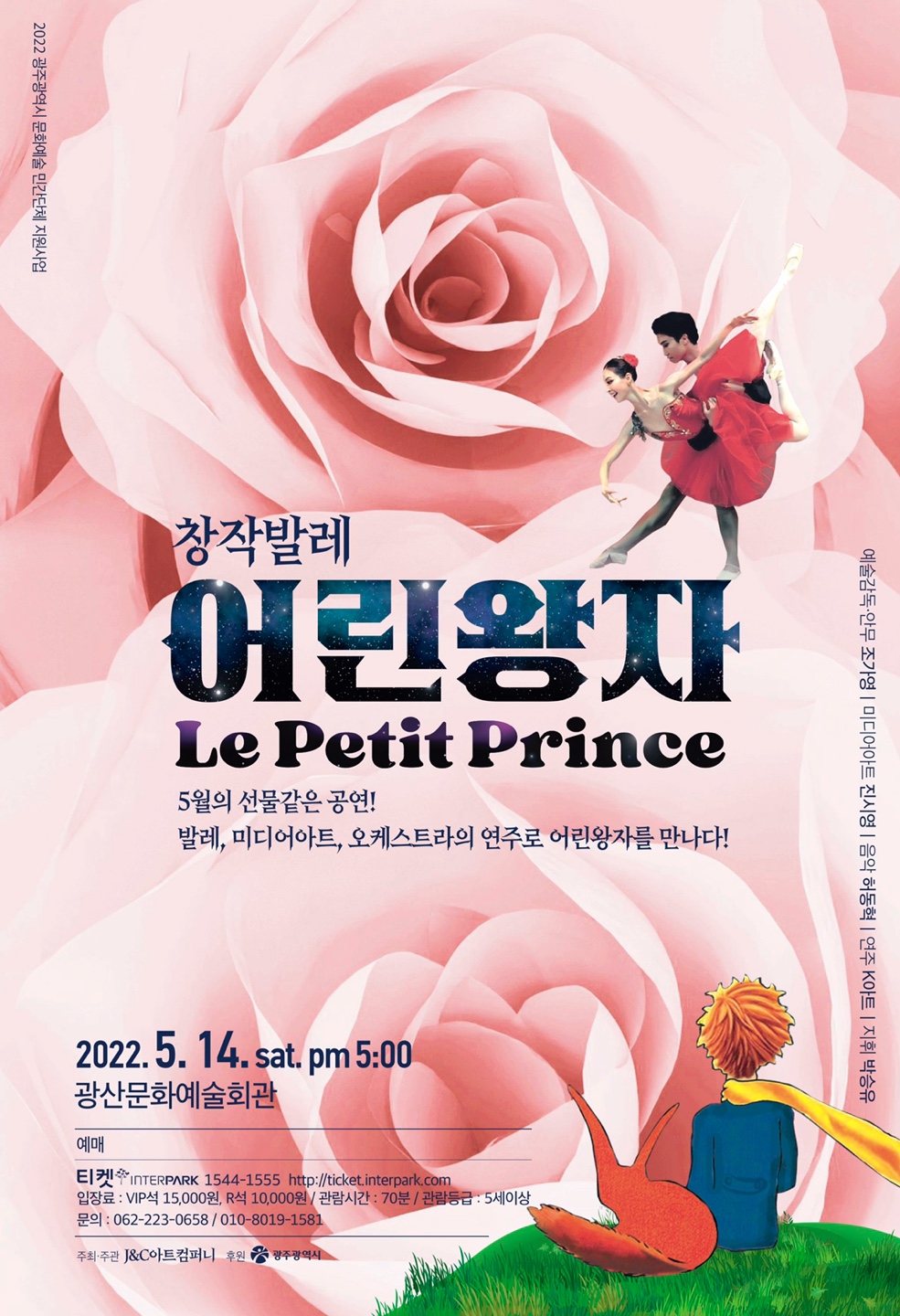 2022 융·복합 판타지 창작발레 "어린왕자"5월의 선물같은 공연! 발레, 미디어아트, 오케스트라의 연주로 어린왕자를 만나다! 일시: 2022. 5. 14.(토) 17:00 장소: 광산문화예술회관(광주 광산구 광산로68번길 13) 관람시간: 70분 관람등급: 5세이상 입장료: VIP석 15,000원, R석 10,000원 티켓☞ 인터파크티켓 https://tickets.interpark.com/goods/22004925 (※예매가능시간: 전일 17시까지) 주최·주관: J&C아트컴퍼니 후원: 광주광역시