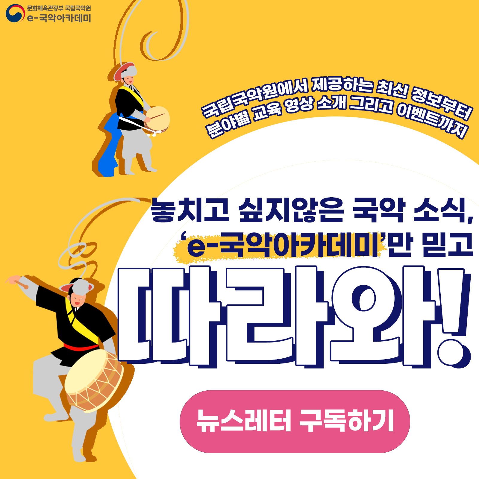 ![]() 최신 국악 정보부터 분야별 교육 영상 소개 그리고 이벤트까지?! 놓치고 싶지 않은 국악 소식, 'e-국악아카데미'만 믿고 따라와! 국립국악원 e-국악아카데미에서 제공하는 분야별 교육 콘텐츠와 이벤트까지 뉴스레터를 만나보세요. 매 월, 따끈따끈한 콘텐츠를 안내합니다. ■ 문의 : 국악진흥과 02-580-3086 |
