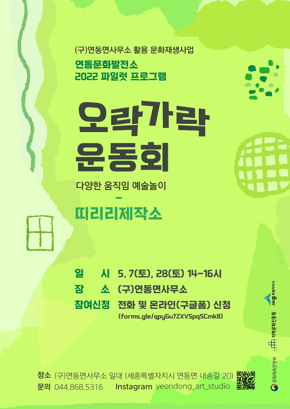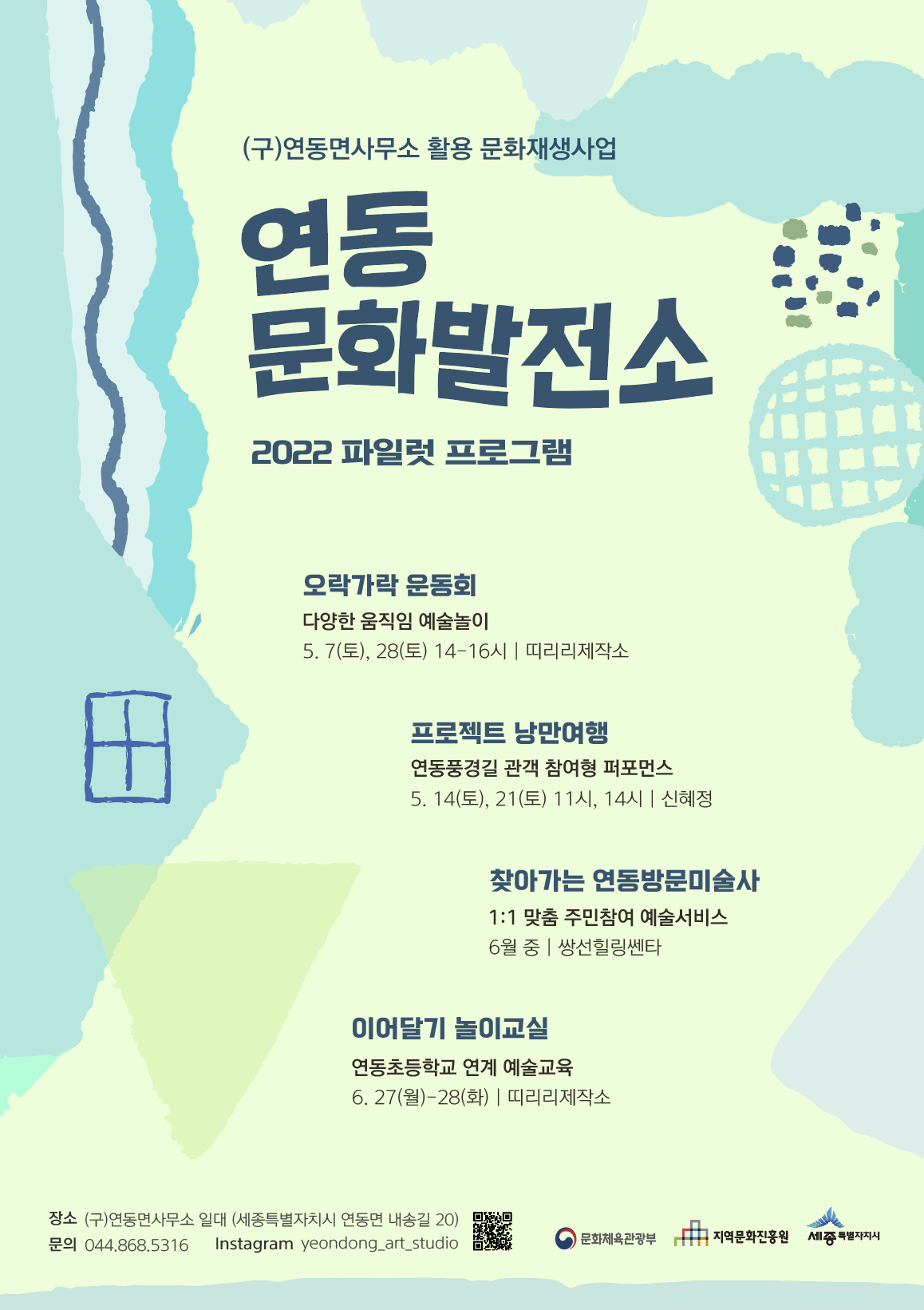 (구)연동면사무소 활용 문화재생사업 – 연동문화발전소 2022 파일럿 프로그램 신청 및 자세한 사항은, 세종시청 홈페이지(www.sejong.go.kr)와 연동문화발전소 SNS(http://www.instagram.com/yeondong_art_studio)에서 확인할 수 있습니다. ♬ 띠리리제작소 @ddi_rri_rri ★ 신혜정 작가 @wantgod21 ♣ 쌍선힐링센터 @ssangsun_healing_center