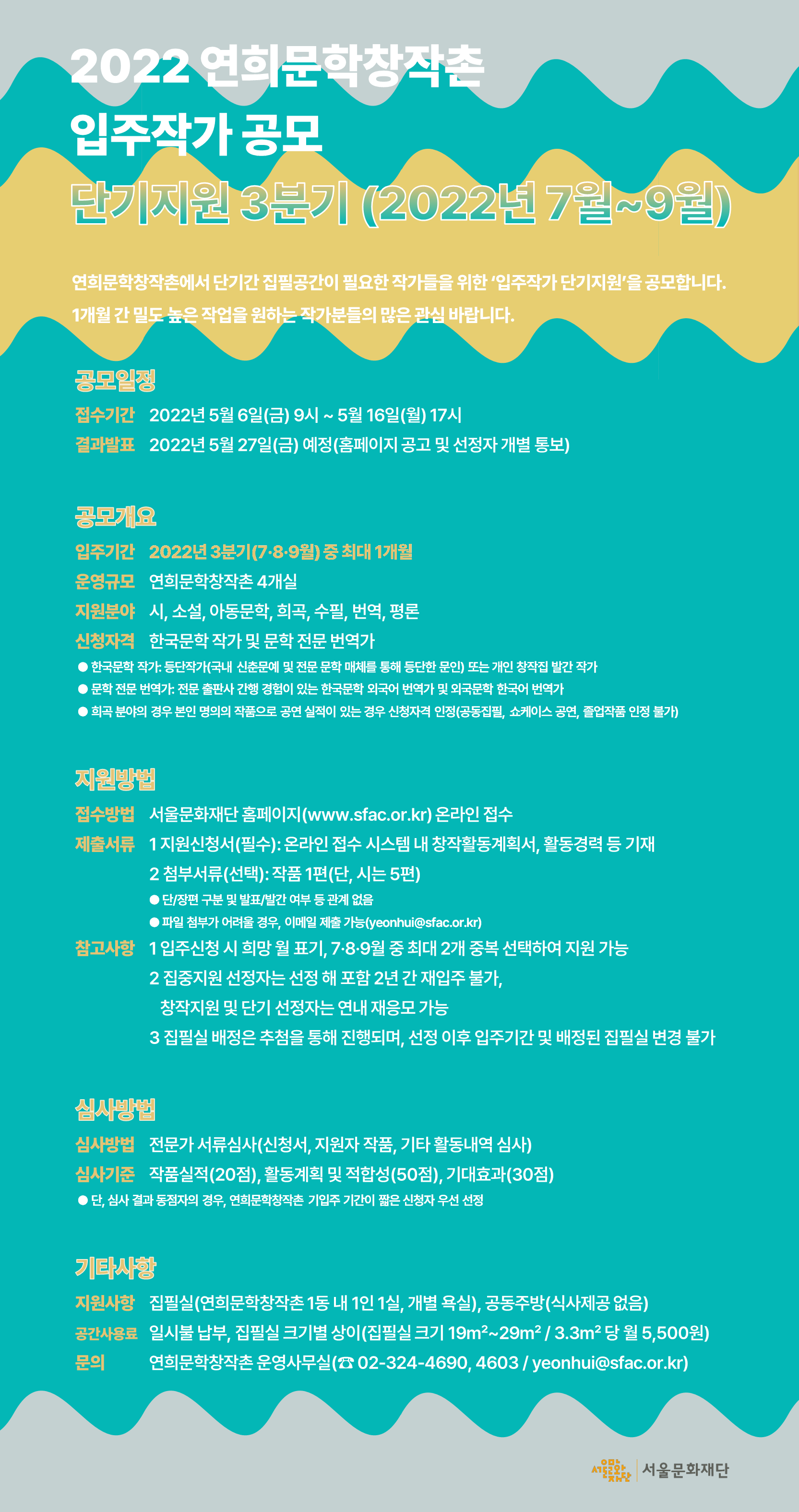 | 2022 연희문학창작촌 입주작가 3분기 단기지원 공모 | |||