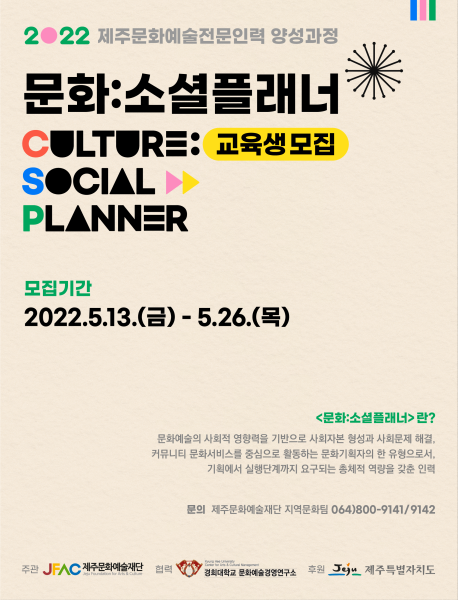 | 2022 제주문화예술전문인력양성 <문화:소셜플래너> 진입과정 (1차년도) 교육생 모집 | |||