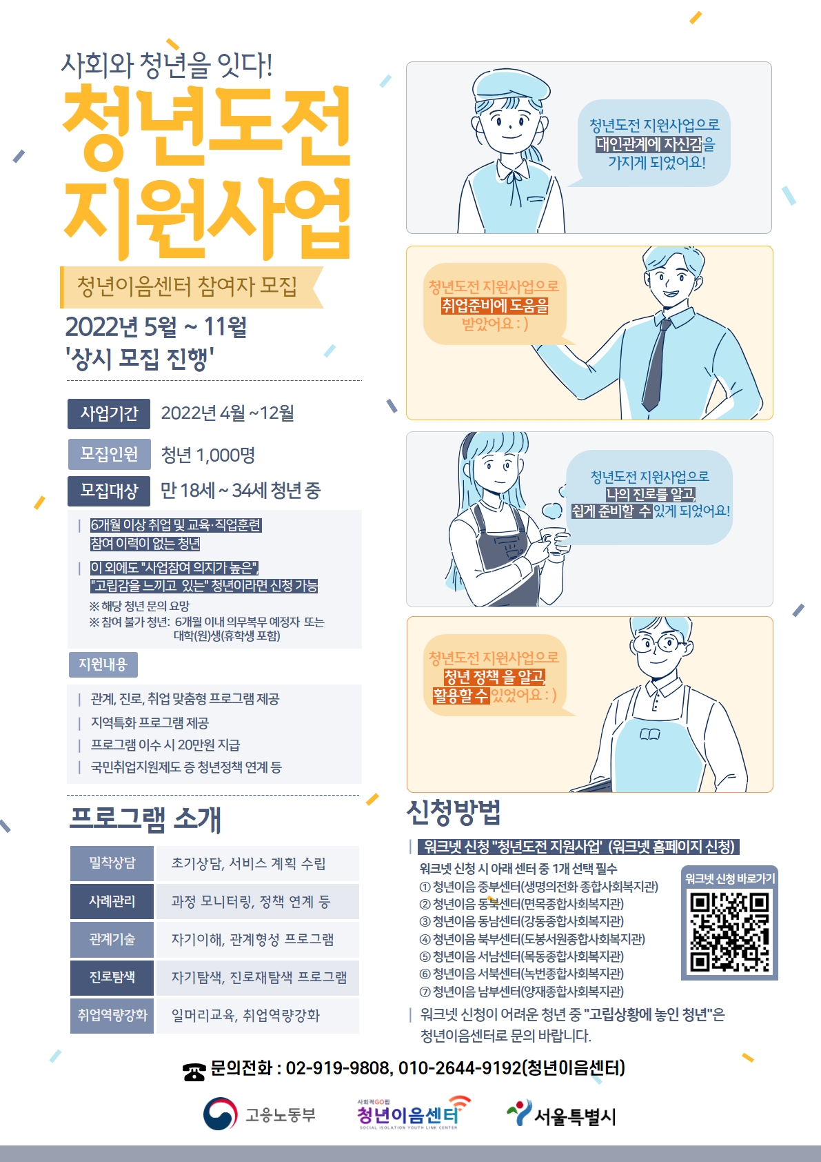 ![]() 1. 사업명: 2022년 서울시 청년도전 지원사업 2. 대상 및 인원: 만 18세~34세 구직단념·고립 청년 약 1,000명 (거주지 무관) 3. 모집기간 ※고립청년은 심층사례관리 대상자로 장기 개입이 필요하여 사업 초기 집중발굴 예정 1) 상시모집: 2022년 5월~11월 2) 고립청년 집중 발굴: 2022년 5월~7월 4. 사업내용 – 사회이행에 어려움을 겪고 있는 구직단념·고립 청년에 대한 맞춤형 통합지원체계를 구축하고, 사회·경제적 활력을 고취하여 안정적인 사회진입을 지원. 5. 지원내용 – 청년 맞춤형 프로그램(관계, 진로, 취업 등) 제공 – 40시간 중 32시간 이수 시 20만원 인센티브 제공 – 청년정책(국민취업지원제도 등) 연계