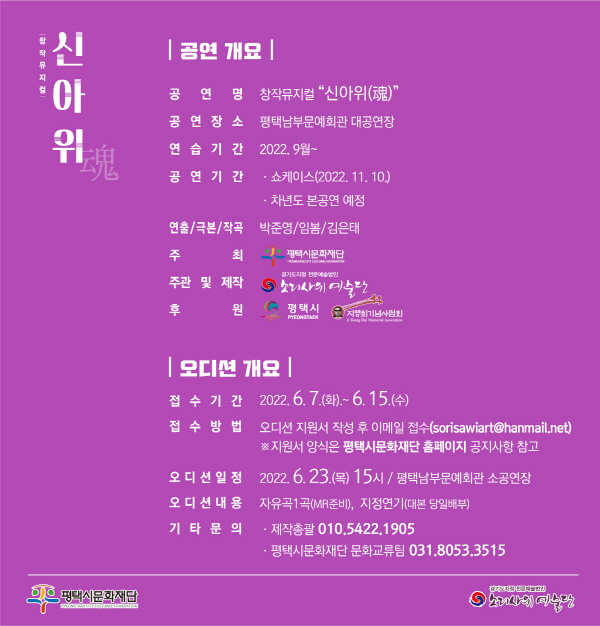 | 2022 평택 창작 공연콘텐츠 발굴 및 지원-쇼케이스 선정작 ‘신아위(魂)’ 공개오디션 안내 | ||||