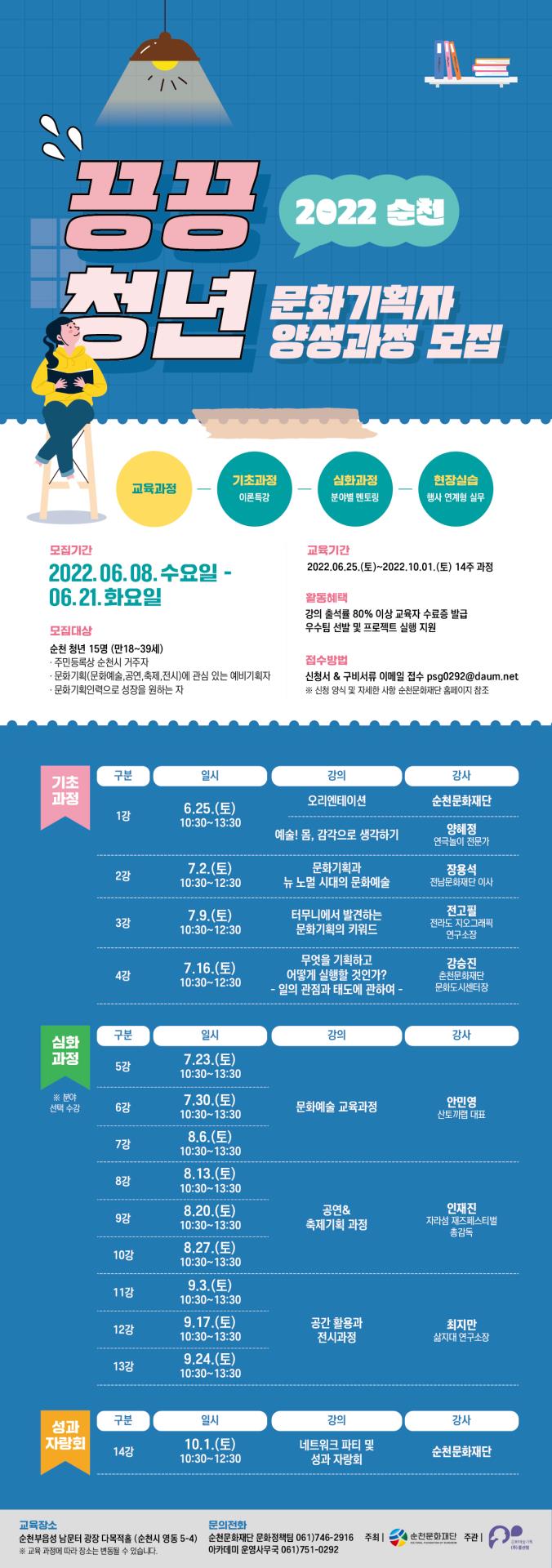 | 분야·대상 | 순천 거주자 또는 소재 직장, 대학교 재직 재학 중인 자, 문화기획에 관심 있는 예비 기획자 | 인원 | 15명 |