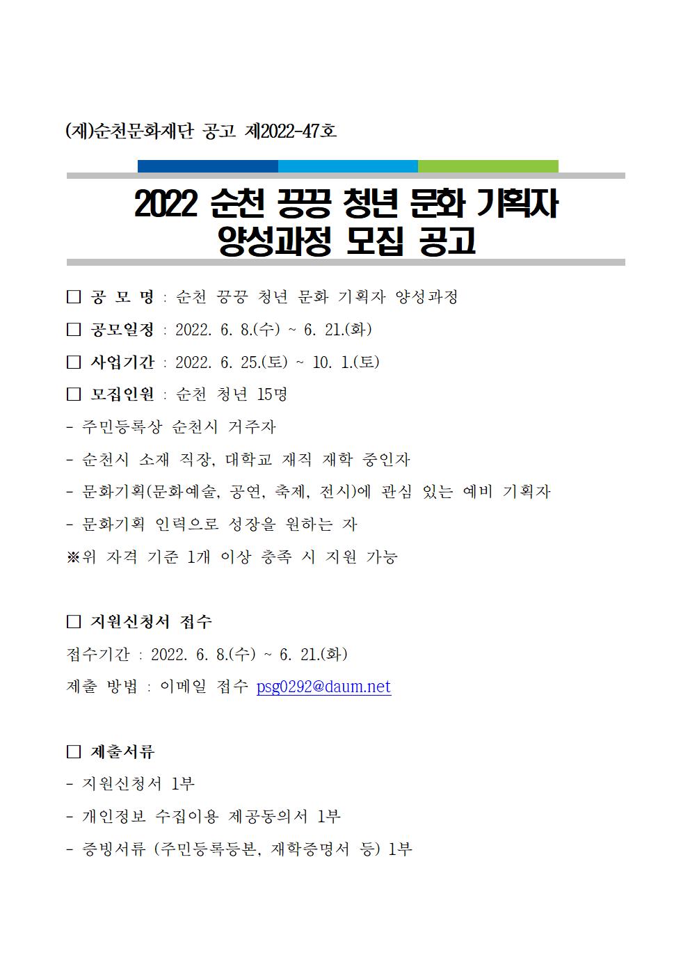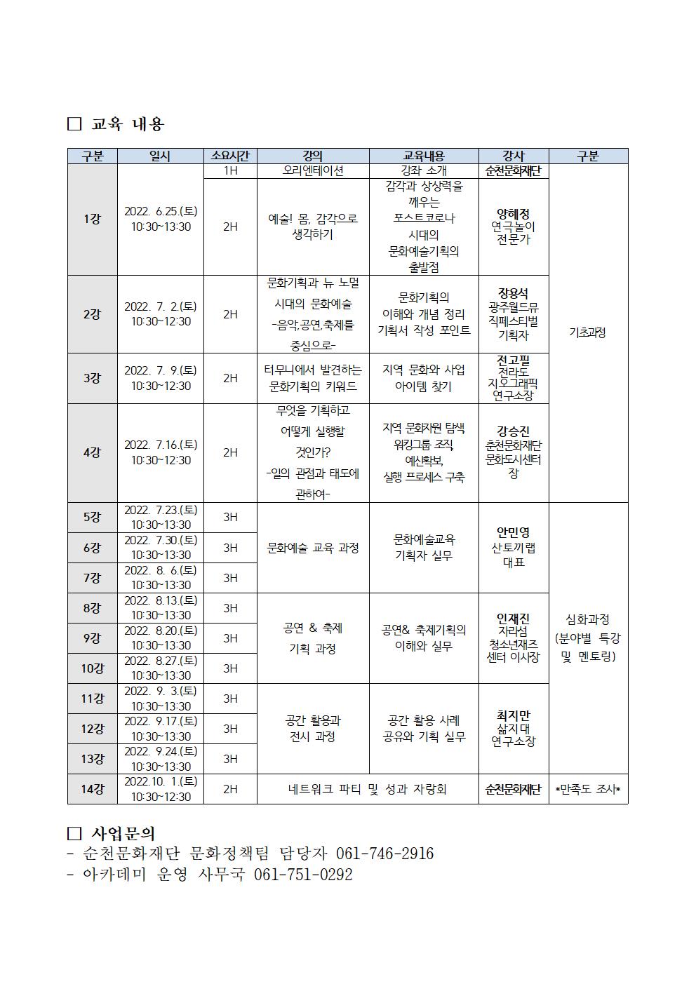 | psg0292@daum.net | 전화번호 | 순천문화재단 문화정책팀 061-746-2916 / 아카데미 운영 사무국 061-751-0292 | |