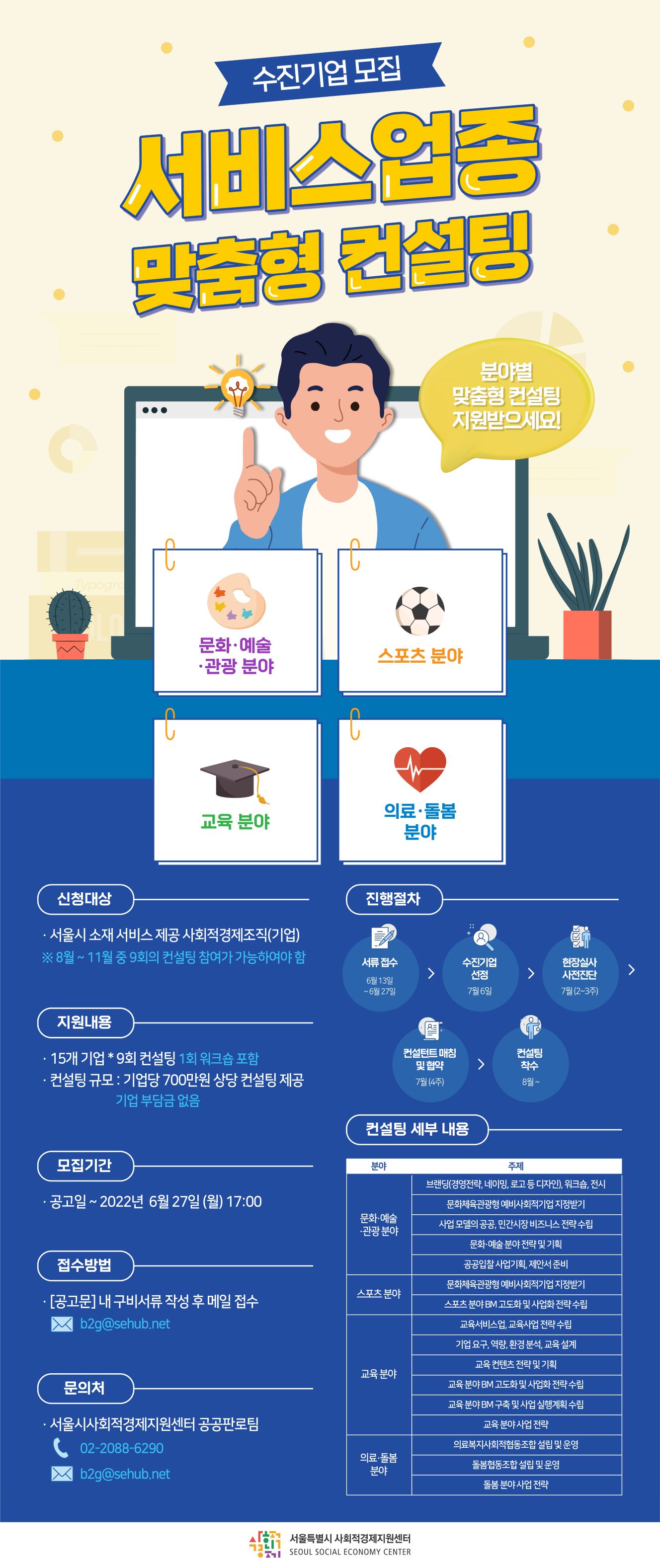 (사 업 명) 2022년 서비스업종 맞춤형 컨설팅 지원 사업 (모집기간) ’22.06.13 (월) ~ 06.27 (월) 17:00 까지 (신청방법) 이메일(b2g@sehub.net) 접수 (지원자격) 서울시 소재 사회적경제조직(기업) (지원규모) 서울시 소재 사회적경제기업 총 15개사, 기업당 9회 컨설팅(1회 워크숍 포함) (지원분야) 4개 분야 중 1개 분야 선택 ⓵ 문화·예술·관광 분야 ⓶ 스포츠 분야 ⓷ 교육 분야 ⓸ 의료·돌봄 분야 (문 의 처) 서울시사회적경제지원센터 공공판로팀 (b2g@sehub.net / ☎ 02-2088-6290) ※ 자세한 사항은 공고문을 참조바랍니다.