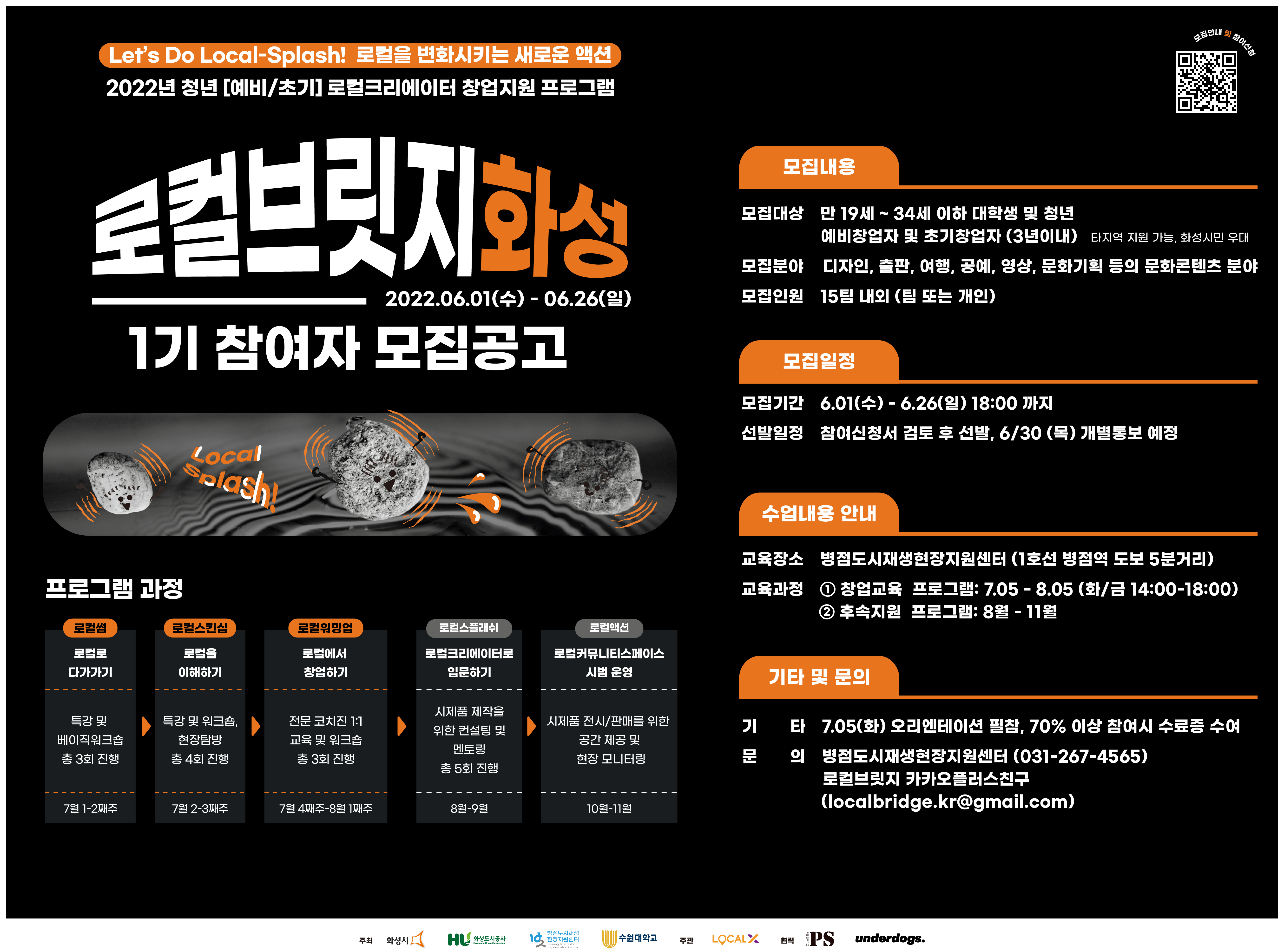![]() ●모집대상: 청년 [예비/초기] 창업자 15팀 이내 (팀 또는 개인) ●모집분야: 디자인, 출판, 여행, 공예, 영상, 문화기획 등의 문화 콘텐츠 분야 ●지원조건: ①만 19세~34세 이하 대학생 및 청년 ②로컬크리에이터 분야 예비 창업자 및 초기 창업자(3년 이내) ※ 타지역 거주자 신청 가능, 화성시민 우대 ●운영기간: ①창업교육프로그램 : 2022년 7월~8월 (매주 화/금, 14:00-18:00) ②후속지원프로그램 : 2022년 8월~11월(시제품 전시 & 판매, 10월 예정) ●운영내용: ①창업교육프로그램 : 베이직워크숍, 창업교육 및 코칭, 사례특강, 현장특강 및 현장탐방 ②후속지원프로그램 : 컨설팅, 시제품 제작 및 전시 & 판매를 위한 로컬커뮤니티스페이스 공간 지원 ●신청기간: 6. 01(수) ~ 6.17(금) 18:00 까지 (발표 : 6월 마지막 주 예정) ●참여혜택: ①프로그램 70% 이상 참여 시 수료증 발급 ②최종사업계획서 우수발표자(10팀 선정)에 한해 창업 아이템을 활용한 시제품 제작 지원 ③컨설팅, 시제품 전시 & 판매를 위한 로컬커뮤니티스페이스 공간 지원 등