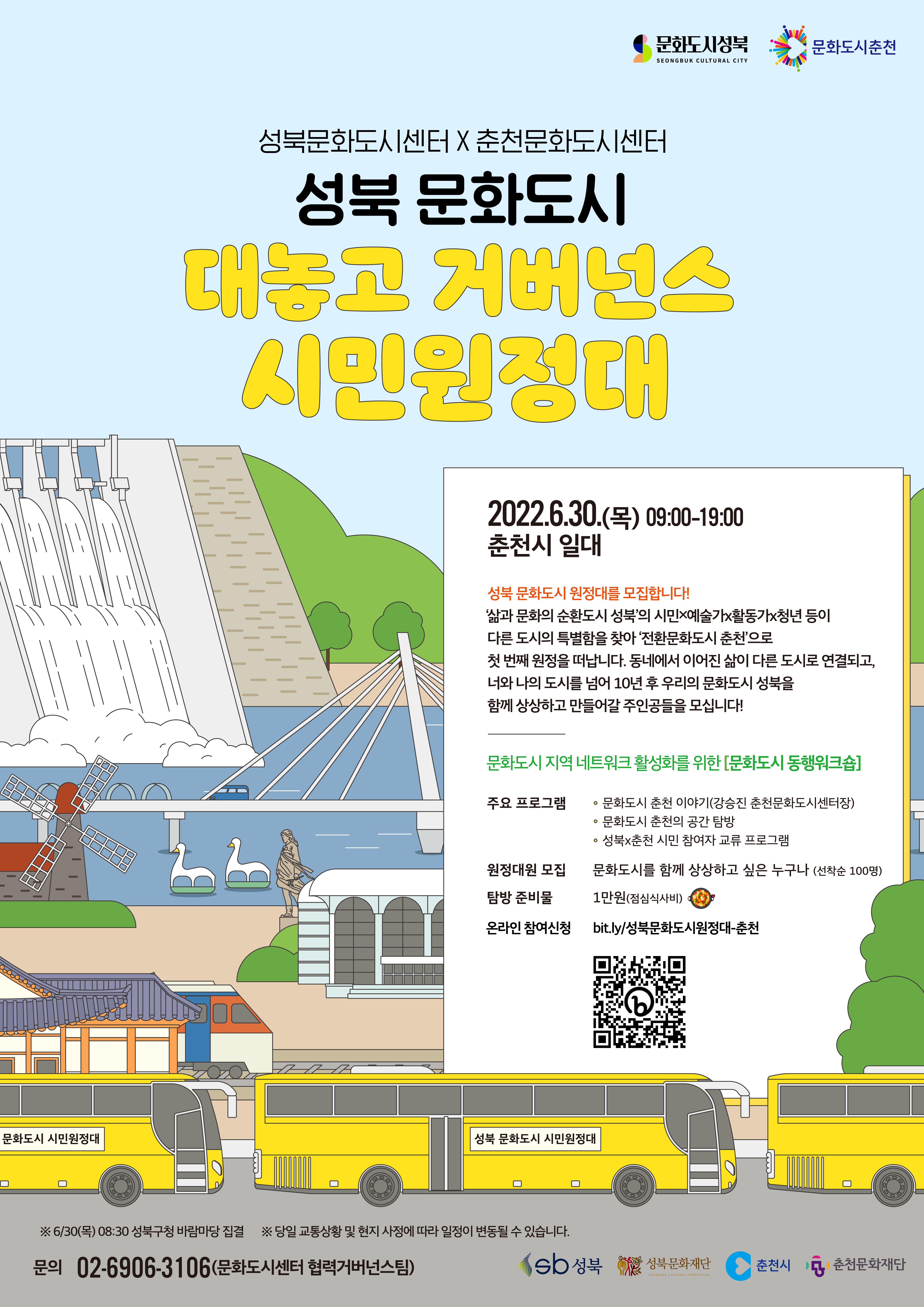 ![]() 성북 문화도시 <대놓고 거버넌스: 시민원정대> - 문화도시 춘천편! 문화로 도시를 상상하는 동네사람들이 새로운 연결을 만들어 갑니다. 함께 상상하는 도시의 미래가 모아져 ‘공존’, ‘공유’, ‘순환’하는 세상이 만들어지길 기대하며 성북에서 춘천으로 문화도시 원정을 떠납니다. 6.30(목) 같이 가실 분들은 아래로 신청해주세요! *마감임박* ✔ 언제? 2022.6.30.(목) 09 ~19시 ✔ 어디로? 춘천시 일대 ※ 6/30(목) 08:30 성북구청 바람마당 집결 ✔ 무엇을? 문화도시 춘천 이야기, 문화도시 춘천의 공간 탐방, 성북×춘천 시민 참여자 교류 ✔ 원정대원 모집: 문화도시를 함께 상상하고 싶은 누구나(*선착순 100명) ✔ 탐방 준비물: 1만원(점심식사비) ✔ 참여신청: bit.ly/성북문화도시원정대-춘천