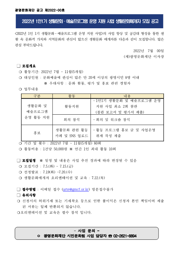 | arte@gmcf.or.kr | 전화번호 | 시민문화팀 사업 담당자 02-2621-8894 | |