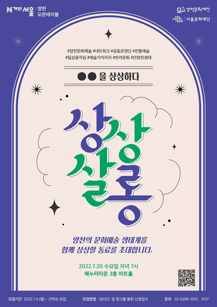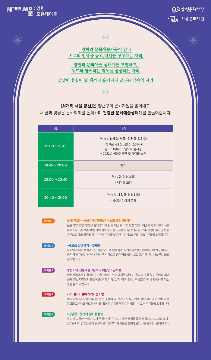 2022 N개의 서울:양천 오픈테이블 <상상살롱> 서울문화재단에서 주최하고, 양천문화재단과 공동운영단 '공공의 상상'이 주관하는 [N개의 서울:양천]은 양천구의 문화자원을 읽어내고 내 삶과 맞닿은 문화의제를 논의하며 건강한 문화예술생태계를 만들어갑니다. <상상살롱>에서 참여를 원하는 테이블 1순위, 2순위를 선택해주시면 모집 마감 후 참석하실 테이블을 공지해드릴 예정입니다. 보다 자세한 사항은 홈페이지 공지사항을 참고해주세요! https://c11.kr/10yb7 오픈테이블 일자: 2022.7.20(수) 19:00 오픈테이블 장소: 해누리타운 2층 아트홀 모집 마감일: ~ 선착순 마감 참가방법: 해당 설문지 작성 후, 모집 마감일 이후 문자로 참석 가능한 테이블 공지 예정 문의: 02-6289-3012, 3017