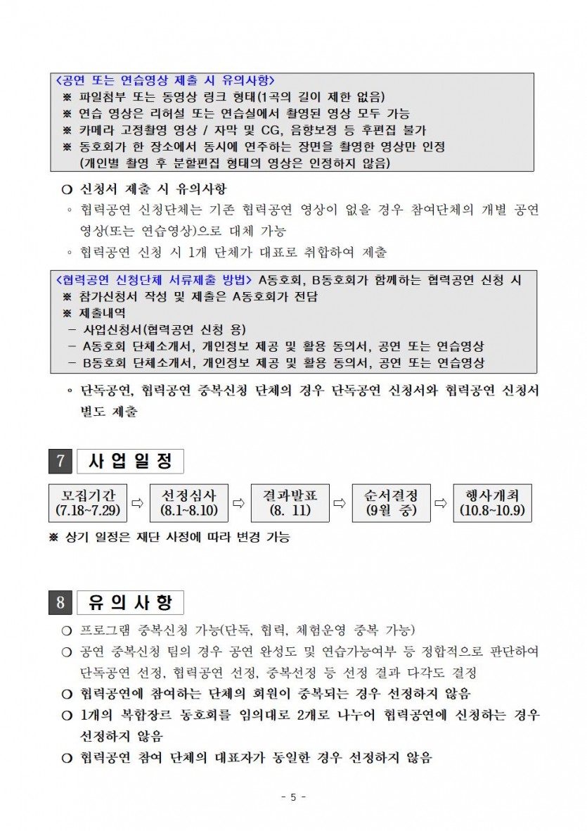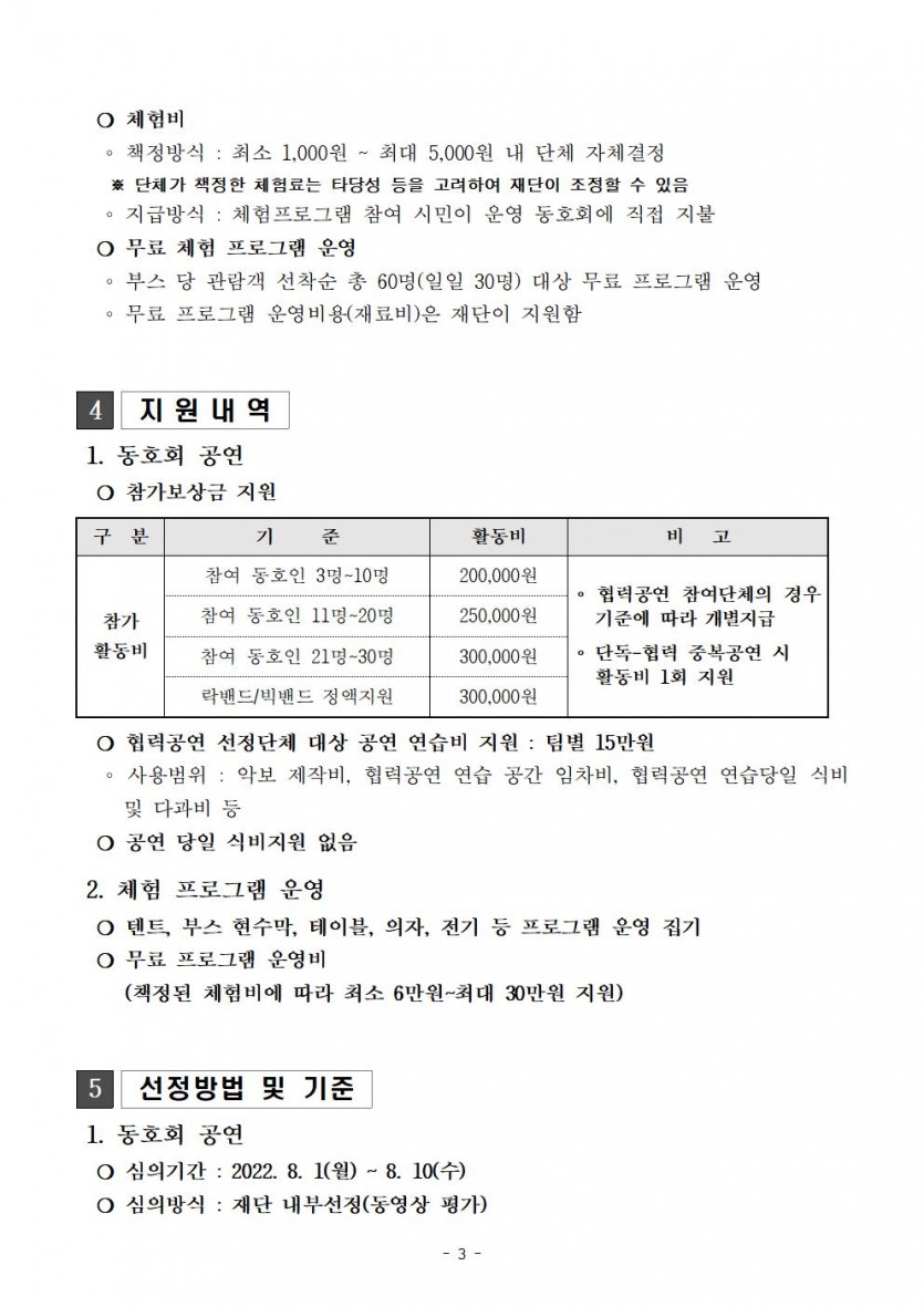 | 분야·대상 | 축제기간 내 참여 가능한 지역 내 공연분야 생활문화동호회 | 인원 | 50단체 내외(단독 및 협력공연) |