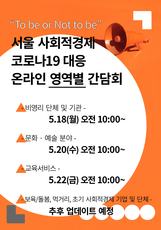 서울 사회적경제 코로나19 대응 온라인 영역별 간담회 코로나위기극복! 함께 해결방안을 모색하는 대화의 장이 마련됩니다!