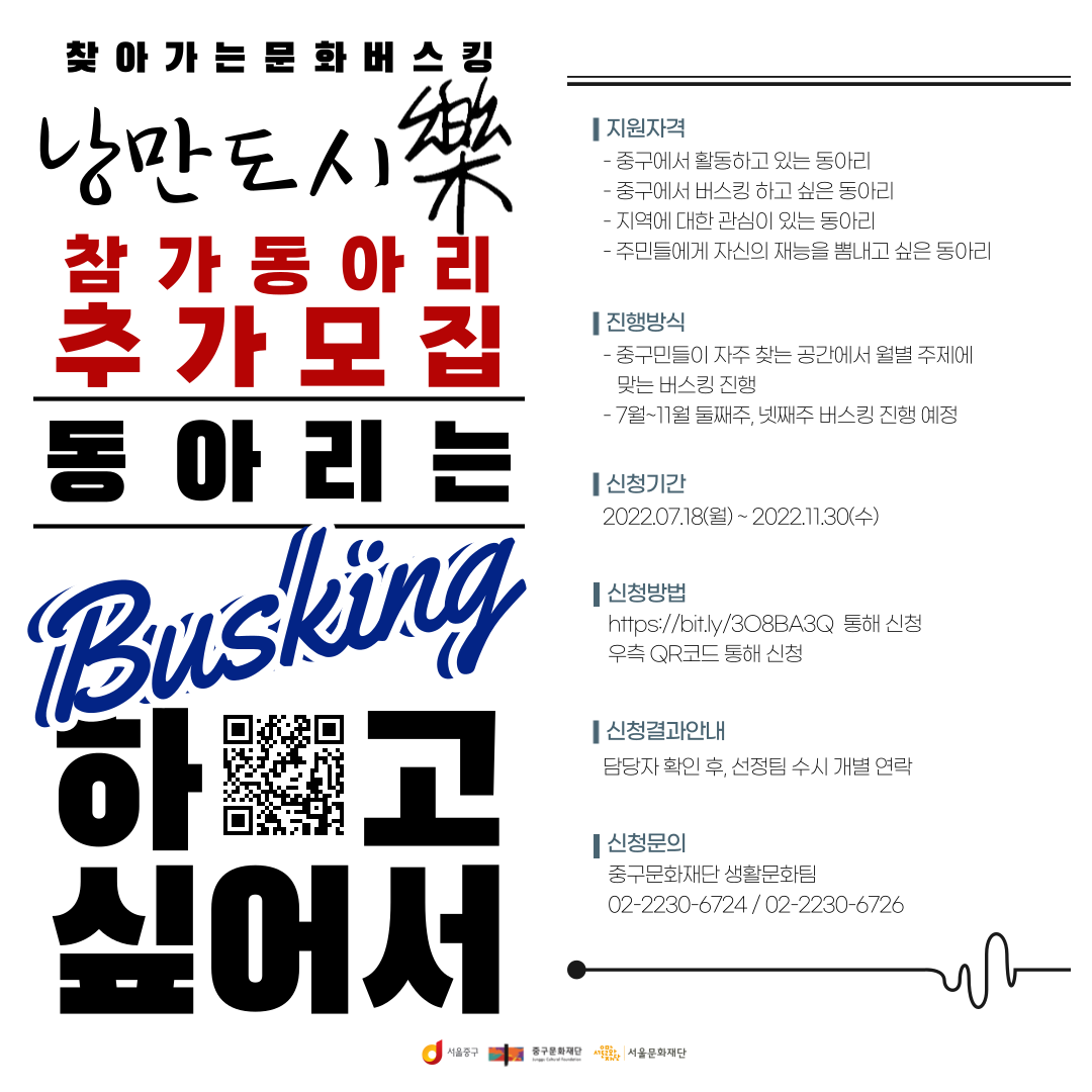 찾아가는 문화버스킹 <낭만도시樂> 에서 공연하고 싶은 참가팀을 모집합니다. <낭만도시樂> 은 중구에서 활동 중인 동아리가 중구 생활권 (신당동, 신당5동, 동화동, 황학동, 청구동, 약수동, 장충동, 다산동) 내에서 주민들이 자주 찾는 장소에 가서 버스킹을 하는 공연 형태의 프로그램입니다. ![]() <모집대상> - 중구에서 활동하고 있는 동아리 - 중구에서 버스킹 하고 싶은 동아리 - 지역에 대한 관심이 있는 동아리 - 주민들에게 자신의 재능을 뽐내고 싶은 동아리 <진행방식> - 중구민들이 자주 찾는 공간에서 월 별 주제에 맞는 버스킹 진행 - 7월~12월 둘째주, 넷째주 버스킹 진행 예정 <신청기간> - 2022년 07월 18일(월) ~ 11월 30일(수) *수시 모집 <신청결과안내> - 담당자 확인 후, 선정팀 수시 개별 연락 <신청문의> - 중구문화재단 생활문화팀 ☎ 02-2230-6724, 02-2230-6726