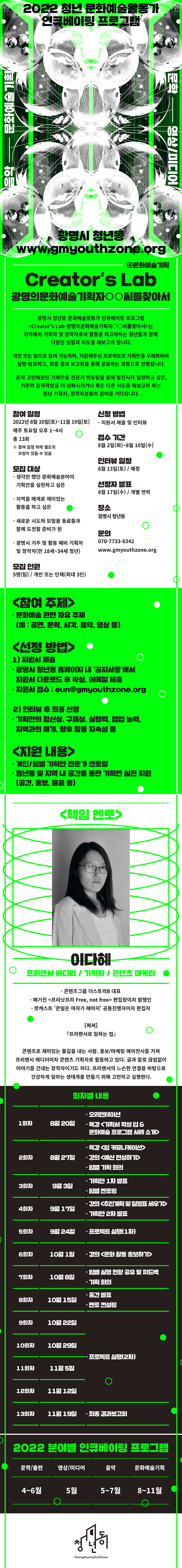 | 분야·대상 | 광명시 거주 및 활동 예비 기획자 및 창작자(만 18세 ~ 34세 청년) | 인원 | 5명(팀) / 개인 또는 단체(최대 3인) |