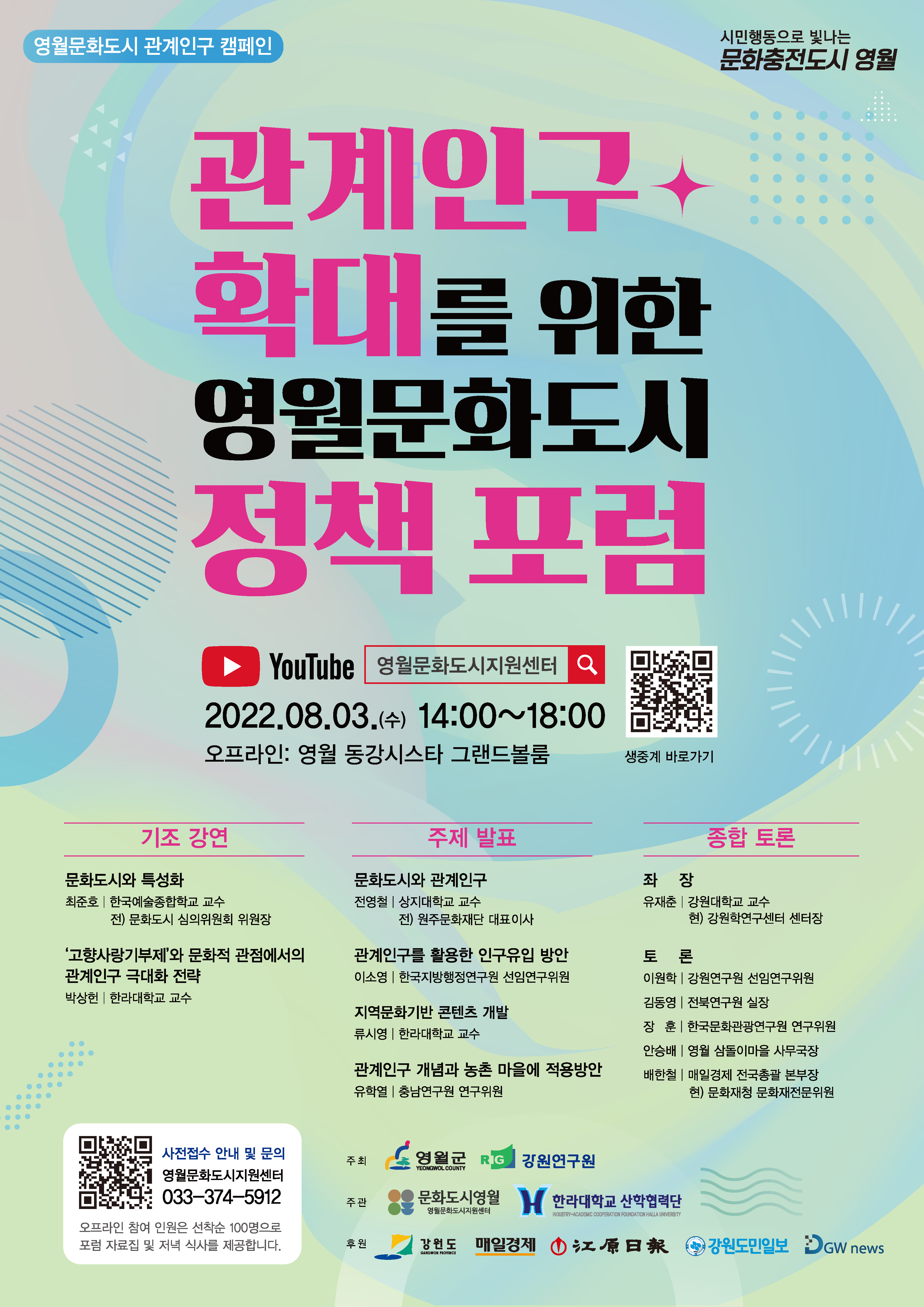 ![]() 안녕하세요. 영월문화도시지원센터입니다. 영월문화도시에서 진행하는 <관계인구 확대를 위한 영월문화도시 정책 포럼>에 여러분을 초대합니다. 이번 포럼은 지역을 활력을 불러넣을 수 있는 방법으로 ‘문화도시’와 ‘관계인구’에 주목하며, 내년 시행될 고향사랑기부금과 함께 지역소멸 위기를 극복할 정책 방향성을 제안하기 위해 마련했습니다. 현장 참여는 물론, 유튜브 생방송으로도 신청 가능하니 관심있는 분들의 많은 참여 부탁드립니다. ☞ 온/오프라인신청하기: https://forms.gle/8SBv7y7YfKkxTfFA8 영월이 궁금하시다면 오프라인으로 참여 신청하세요! ● 일시 : 2022년 8월 3일(수) 14시 00분 (13시 30분 입장 가능) ● 장소 : 영월 동강시스타 그랜드볼룸 ● 문의 : ☎033-374-5912 (영월문화도시지원센터) |