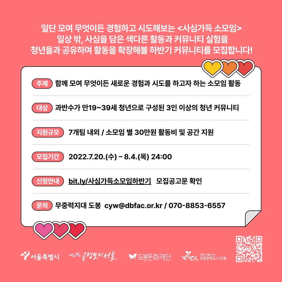 ◆ 신청안내: https://bit.ly/사심가득소모임하반기 ※모집공고문 확인 및 신청서 작성 후 이메일 지원