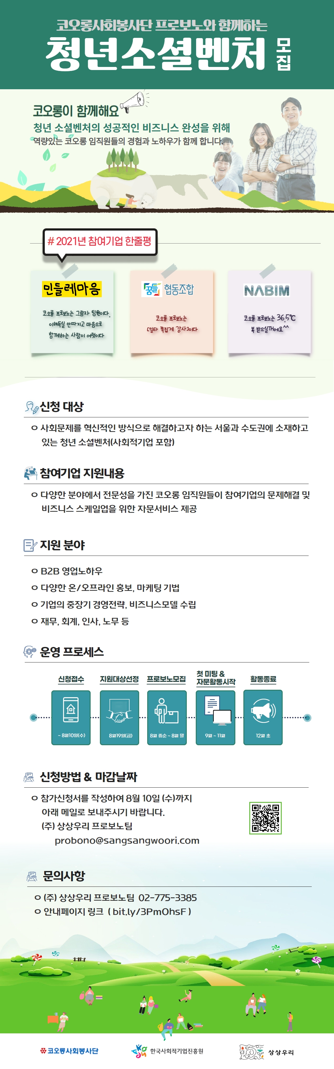 | 코오롱사회봉사단 프로보노와 함께하는 청년소셜벤처 모집 (~8.10) | |||