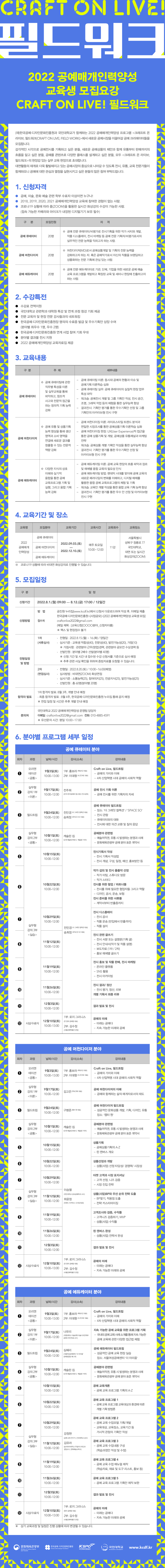 「2022 공예매개인력양성」 교육생 모집요강 CRAFT ON LIVE! 필드워크 (재)한국공예·디자인문화진흥원과 국민대학교가 함께하는 2022 공예매개인력양성 프로그램 <크래프트 온 라이브; 필드워크(CRAFT ON LIVE; FIELD WORK)>에서 새로운 공예시장을 이끌어갈 공예 크리에이터들을 모집합니다. 감각적인 시각으로 공예전시를 기획하고 싶은 분들, 새로운 공예상품의 제안과 함께 유통부터 판매까지의 흐름을 알고 싶은 분들, 공예를 콘텐츠로 다양한 클래스를 설계하고 싶은 분들, 모두 <크래프트 온 라이브; 필드워크>의 현장감 있는 실무 교육 현장으로 초대합니다. 대면활동의 재개로 더욱 활발해지고 있는 공예시장의 중심으로 나아갈 수 있도록 전시, 유통, 교육 전문가들이 함께하오니 공예에 대한 관심과 열정을 실현시키고 싶은 분들의 많은 참여 부탁드립니다. 1. 신청 자격 • 공예, 미술, 문화 예술 관련 학부 수료자 이상이면 누구나! • 2018, 2019, 2020, 2021 공예매개인력양성 교육에 참여한 경험이 없는 사람. • 코로나19 상황에 따라 줌(ZOOM)을 활용한 실시간 화상강의 수강이 가능한 사람. (접속 가능한 카메라와 마이크가 내장된 디지털기기 보유 필수) 구분 | 모집인원 | 자격 | 공예 큐레이터 | 20명 | 공예 전문 큐레이터/비평가로 전시기획을 위한 작가 서치와 개발, 작품 디스플레이, 전시 마케팅 등 공예 전문 기획자/비평가로서의 실무적인 전문 능력을 익히고자 하는 사람. | 공예 머천다이저 | 20명 | 머천다이저(MD)로서 공예상품개발 및 기획의 전문 능력을 강화하고자 하는 자. 혹은 공예작가로서 자신의 작품을 브랜딩하고 상품화하는 전문 기획에 관심 있는 사람. | 공예 에듀케이터 | 20명 | 공예 전문 에듀케이터로 기관, 단체, 기업을 위한 새로운 공예 예술 교육 프로그램을 개발하고 확장된 교육 및 세미나 현장에 진출하고자 하는 사람. | 2. 수강 특전 • 수강료 전액지원 • 국민대학교 관련학과 대학원 특강 및 연계 과정 청강 기회 제공 • 전문 교육자 및 현장 전문 강사들과의 네트워킹 • 한국공예・디자인문화진흥원장 명의의 수료증 발급 및 우수기획안 상장 수여(분야별 최우수 1명, 우수 2명) • 한국공예・디자인문화진흥원 연계 사업 참여 기회 우대 • 분야별 결과물 전시 지원 • 2022 공예매개인력양성 교육자료집 제공 3. 교육내용 구분 | 주제 | 세부내용 | 공예 큐레이터 | 공예 큐레이팅에 관한 직무별 특성을 이론 및 실무교육을 통해 파악하고, 창조적 사고와 전문적 접근을 하는 창의적 기획 능력 강화 | 공예 큐레이팅 이론: 동시대 공예의 현황과 이슈 및 공예기획 이론학습 심화 공예 큐레이팅 실무: 공예 큐레이터의 실질적 현장 업무 특성 파악 워크숍: 공예전시 개별 및 그룹 기획안 작성, 전시 공간, 조명, 그래픽 작업 등의 체험을 통한 실무능력 향상 결과전시: 기획안 평가를 통한 우수기획안 선정 및 그룹 기획안의 아카이브형 전시 구현 | 공예 머천다이저 | 공예 유통 및 상품기획 능력 향상을 통해 생산 영역과 소비 영역을 연결해 새로운 결과를 창출할 수 있는 전문적 역량 강화 | 공예 머천다이징 이론: 라이프스타일 트렌드 분석과 면밀한 시장조사를 통한 공예상품기획 이론학습 심화 공예 머천다이징 현장: UX(User Experience)적 접근을 통한 공예 상품기획 및 개발, 공예상품 유통채널과 마케팅 전략 워크숍: 공예상품 개별 기획안 작성을 통한 실무능력 향상 결과전시: 기획안 평가를 통한 우수기획안 선정 및 아카이브형 전시 구현 | 공예 에듀케이터 | 다양한 지식의 상호 이해와 실기적 융합을 통한 공예 교육프로그램 기획 및 실행, 그리고 융합 기획 능력 강화 | 공예 에듀케이팅 이론: 공예 교육 현장의 흐름 파악과 장르 및 매체별 융합 교육의 필요성 인식 공예 에듀케이팅 방법: 팬데믹 시대를 맞이해 공예 교육의 새로운 패러다임의 변화를 이해하고, 디지털 매체를 활용한 융합 공예 교육프로그램의 체험 및 기획 워크숍: 교육안 개별 작성을 통한 융합 교육 기획 능력 향상 결과전시: 기획안 평가를 통한 우수 안 선정 및 아카이브형 전시 구현 |