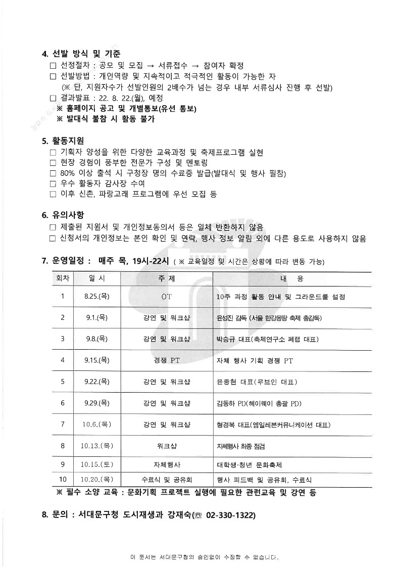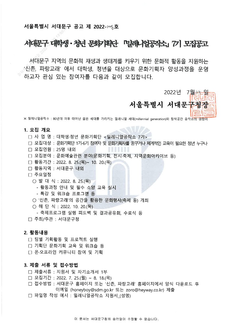 | 서대문구 대학생·청년 문화기획단 「밀레니얼공작소 7기」 모집 | |||