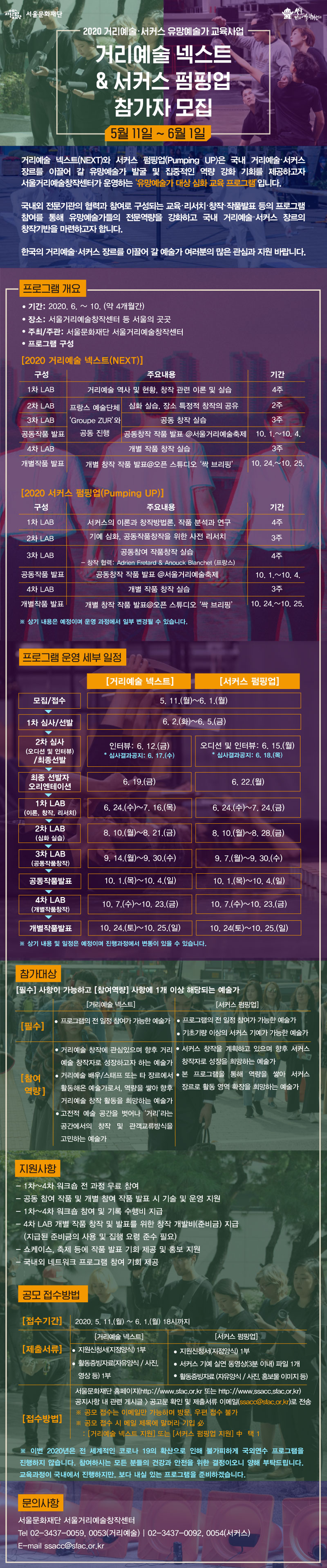 2020 거리예술·서커스 유망예술가 교육사업 거리예술 넥스트 & 서커스 펌핑업 참가자 모집 안내   거리예술 넥스트(NEXT)와 서커스 펌핑업(Circus Pumping UP) 은 국내 거리예술․서커스 장르를 이끌어갈 유망예술가 발굴 및 집중적인 역량 강화 기회를 제공하고자 서울거리예술창작센터가 운영하는 유망예술가 대상 심화 교육 프로그램입니다.   국내외 전문기관의 협력과 참여로 구성되는 교육리서치창작작품발표 등의 프로그램 참여를 통해 유망예술가들의 전문 역량을 강화하고 국내 거리예술․서커스 장르의 창작기반을 마련하고자 합니다.