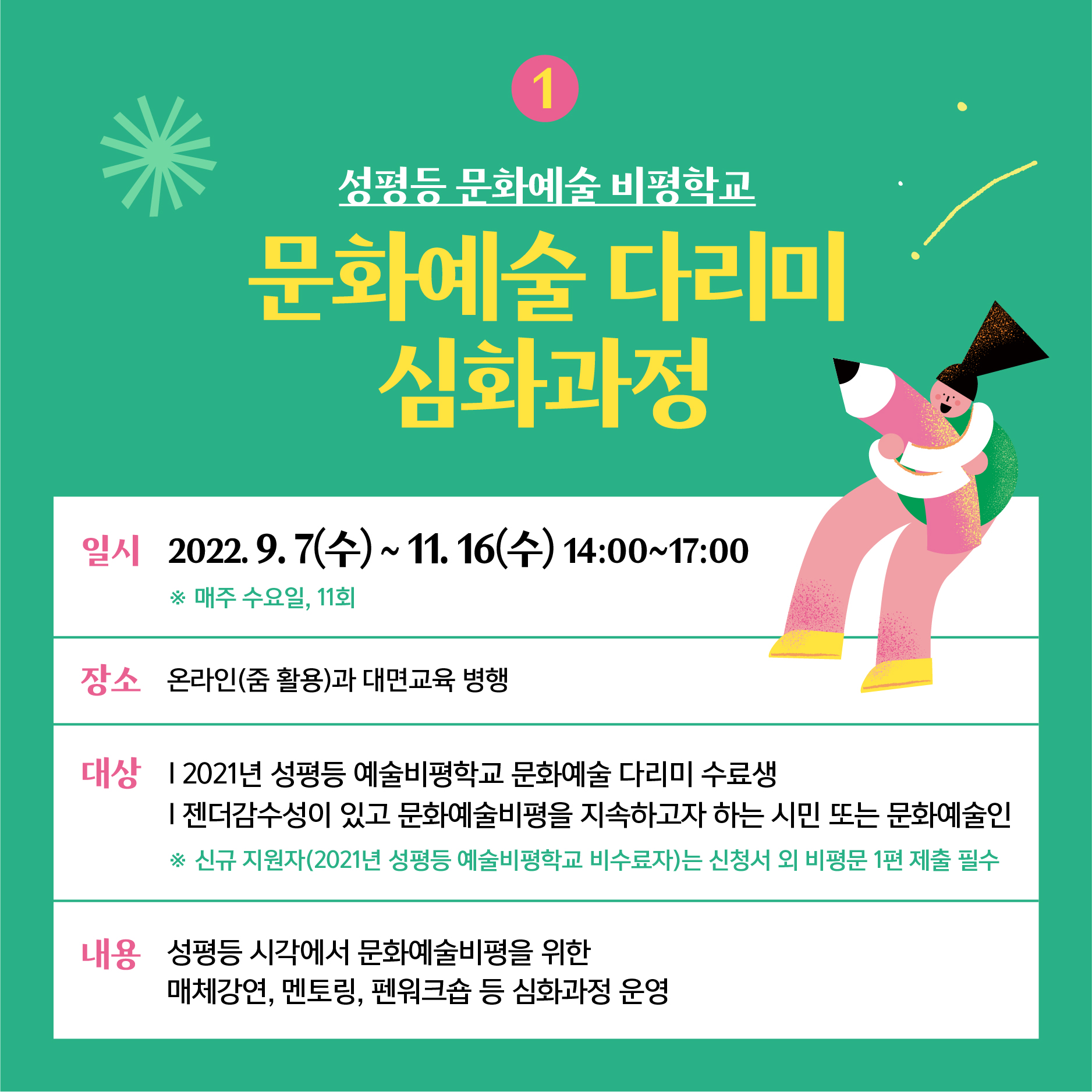 | 분야·대상 | 2021년도 성평등 예술비평학교 ‘문화예술다리미’ 기초과정 수료생 / 젠더감수성이 있고 성평등 관점으로 문화예술비평을 지속하고자 하는 시민 또는 문화예술인 | 인원 | 10명 내외 |