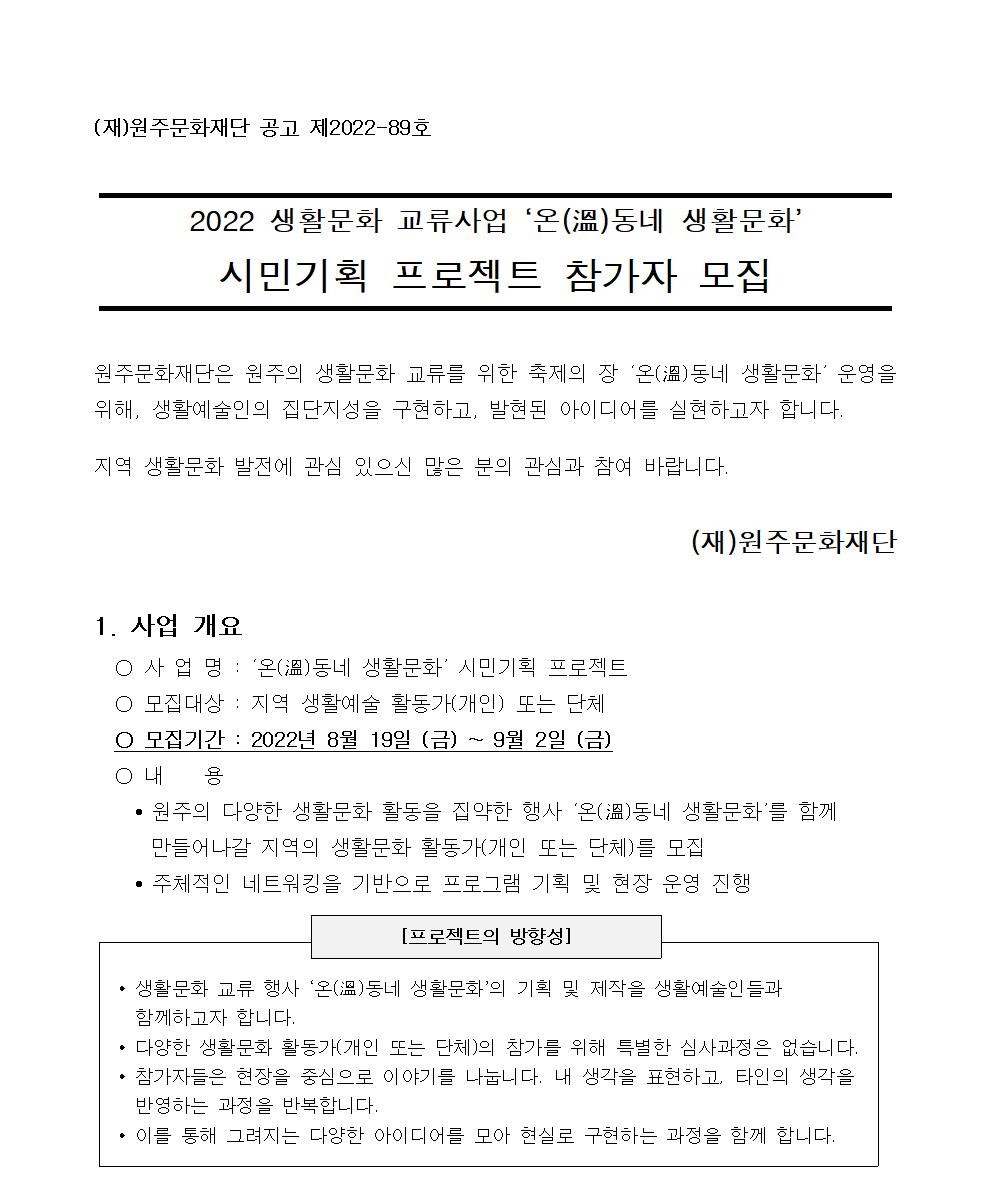 | 2022 생활문화 교류사업 '온(溫)동네 생활문화' 시민기획 프로젝트 참가자 모집 | |||