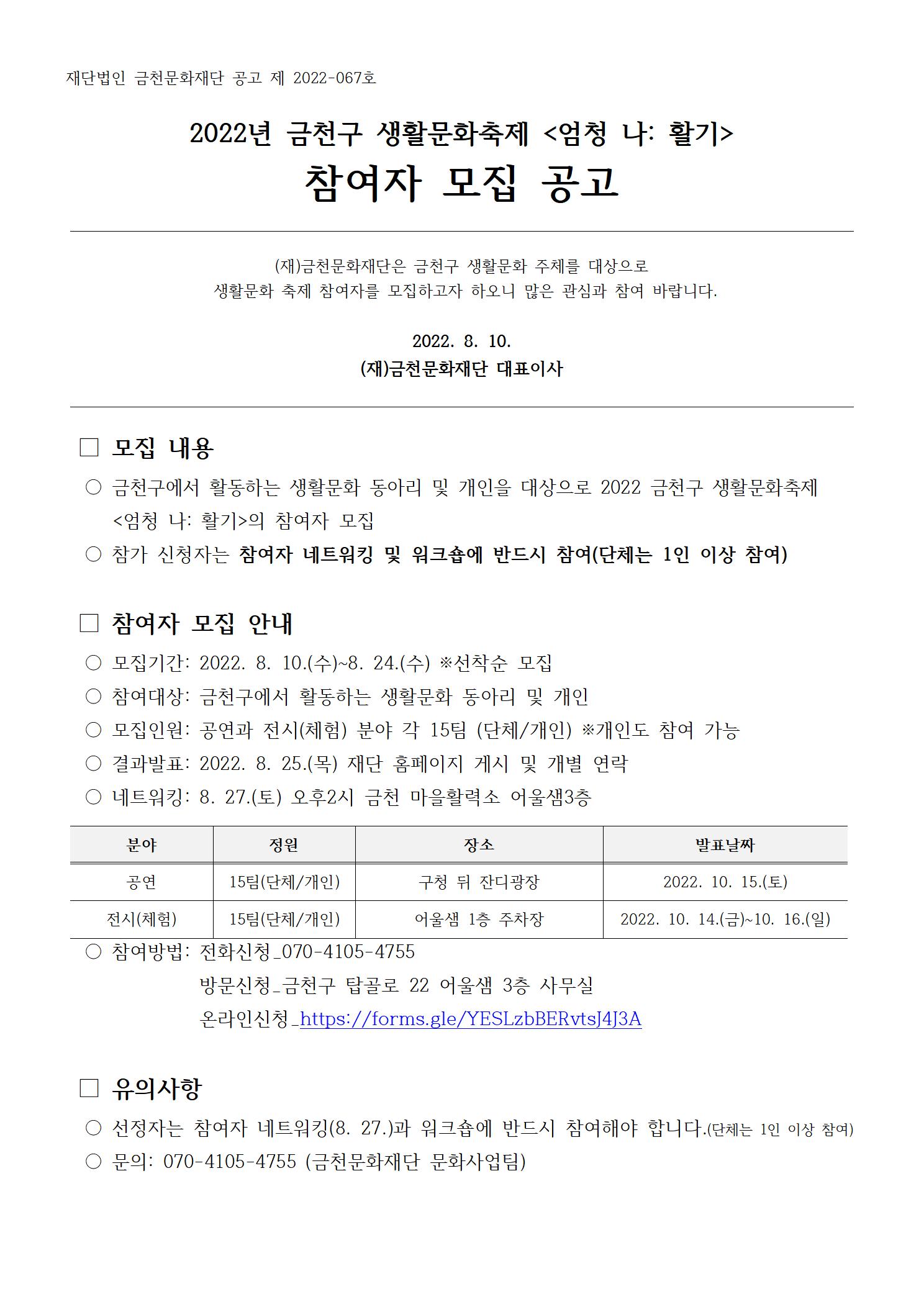 | 금천 생활문화 축제 <엄청 나: 활기> 참여자 모집 | |||